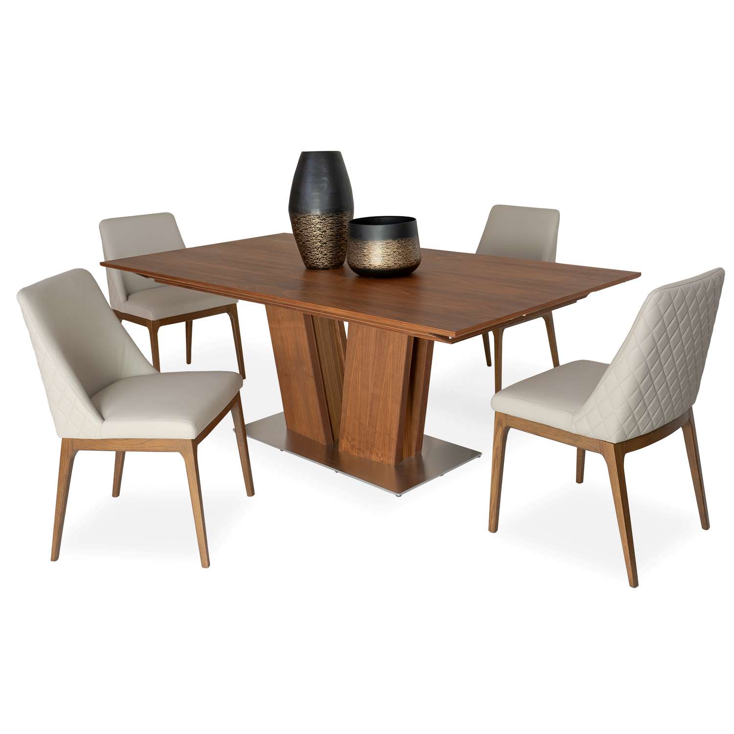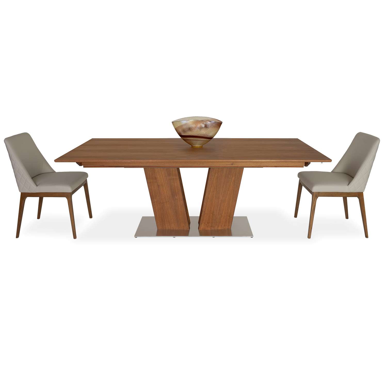 The Lea dining table from Skovby features a modern design with a sculptural V-shaped base. This innovative design allows you to place your chairs as you please without being hindered by table legs. The Lea table also has a patented extension system with a folding leaf stored under the table top and seats six to twelve diners with an extended length of 118". Stocked in oiled walnut.
