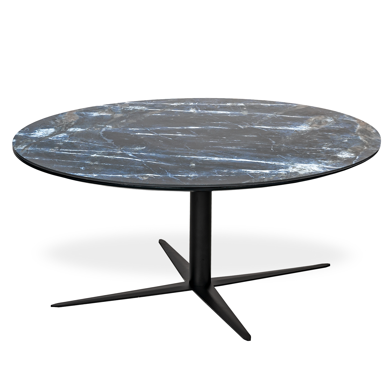 [0] => The Leandro Coffee Table features a gorgeous tabletop made of sodalite blue ceramic marble with white and beige accents. A cross-shaped black metal base provides stability and a stylish contrast with the brighter shades of the circular top. Set Leandro in front of a contemporary sofa or sectional for an elegant spot to place beverages, books, decor, and more.