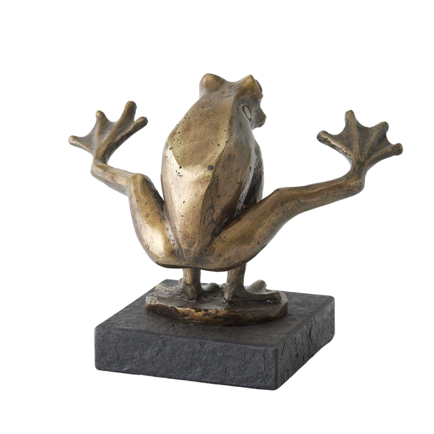 The Leap Frog Sculpture embodies playful energy in its depiction of a frog with its front legs planted on the ground and its back legs lifted in mid-leap. Wrought from cast iron with a bronze finish, this sculpture stands on a black marble base and makes a perfect gift for lovers of animals and nature.