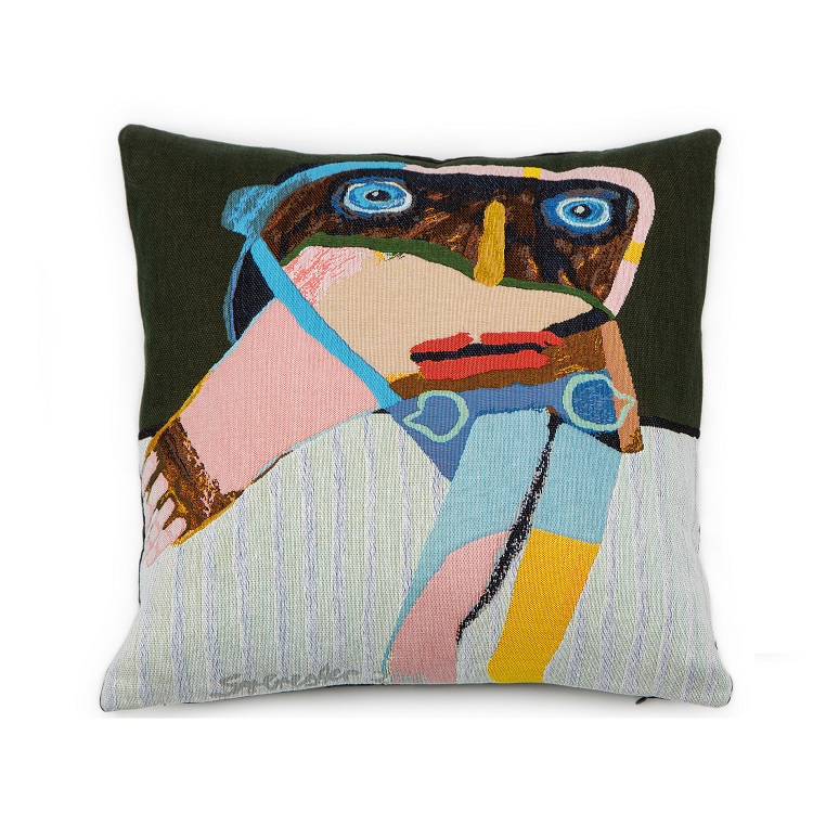 [0] => The Female Staring Pillow features a portrait of a woman by Danish artist Leif Sylvester, rendered in vivid blue, pink, yellow, red, and brown. What makes this pillow truly "art" is its jacquard style woven design that brings the work of Picasso to your home, directly imported from France. The perfect gift or addition for an art enthusiast, artist, or anyone who loves a timeless masterpiece.