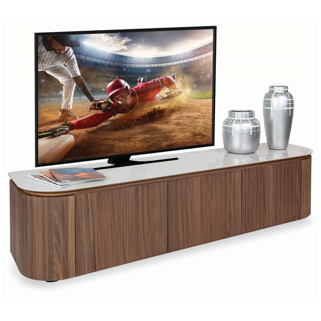 The Liam TV Stand features a walnut-veneered base and rounded front corners reminiscent of mid-century modern design. A white Veneto ceramic top with grey veining provides a cool-toned and elegant contrast to the warmth of the wood. Store all you need for movie nights and binge-watch sessions in Liam's three soft-close cabinets, whose smooth surfaces create a cohesive appearance across the front of the stand. A small cutout between Liam's top and base adds a layered look, while carved vertical lines in the wood evoke the iconic design of tambour doors.