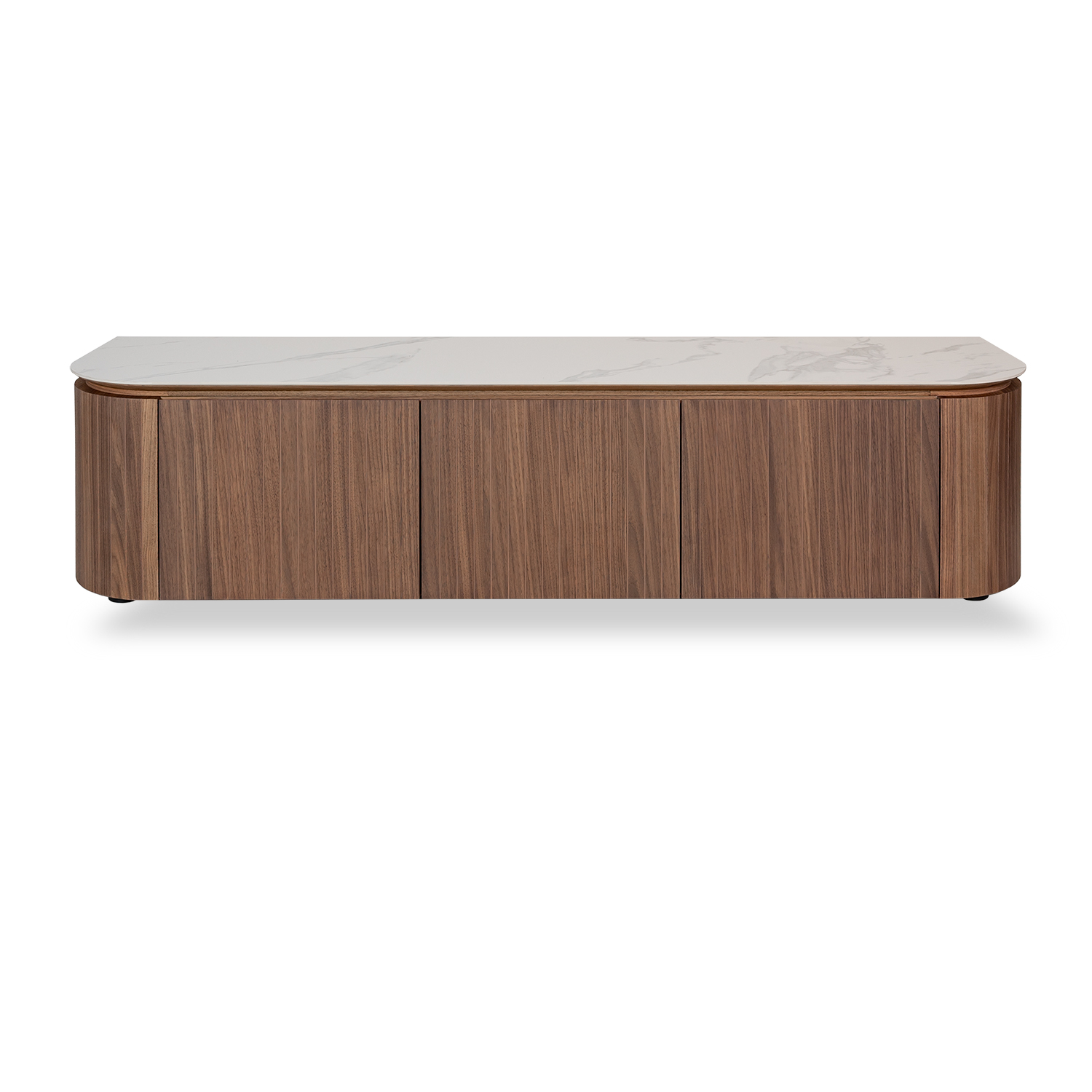 [0] => The Liam TV Stand features a walnut-veneered base and rounded front corners reminiscent of mid-century modern design. A white Veneto ceramic top with grey veining provides a cool-toned and elegant contrast to the warmth of the wood. Store all you need for movie nights and binge-watch sessions in Liam's three soft-close cabinets, whose smooth surfaces create a cohesive appearance across the front of the stand. A small cutout between Liam's top and base adds a layered look, while carved vertical lines in the wood evoke the iconic design of tambour doors.