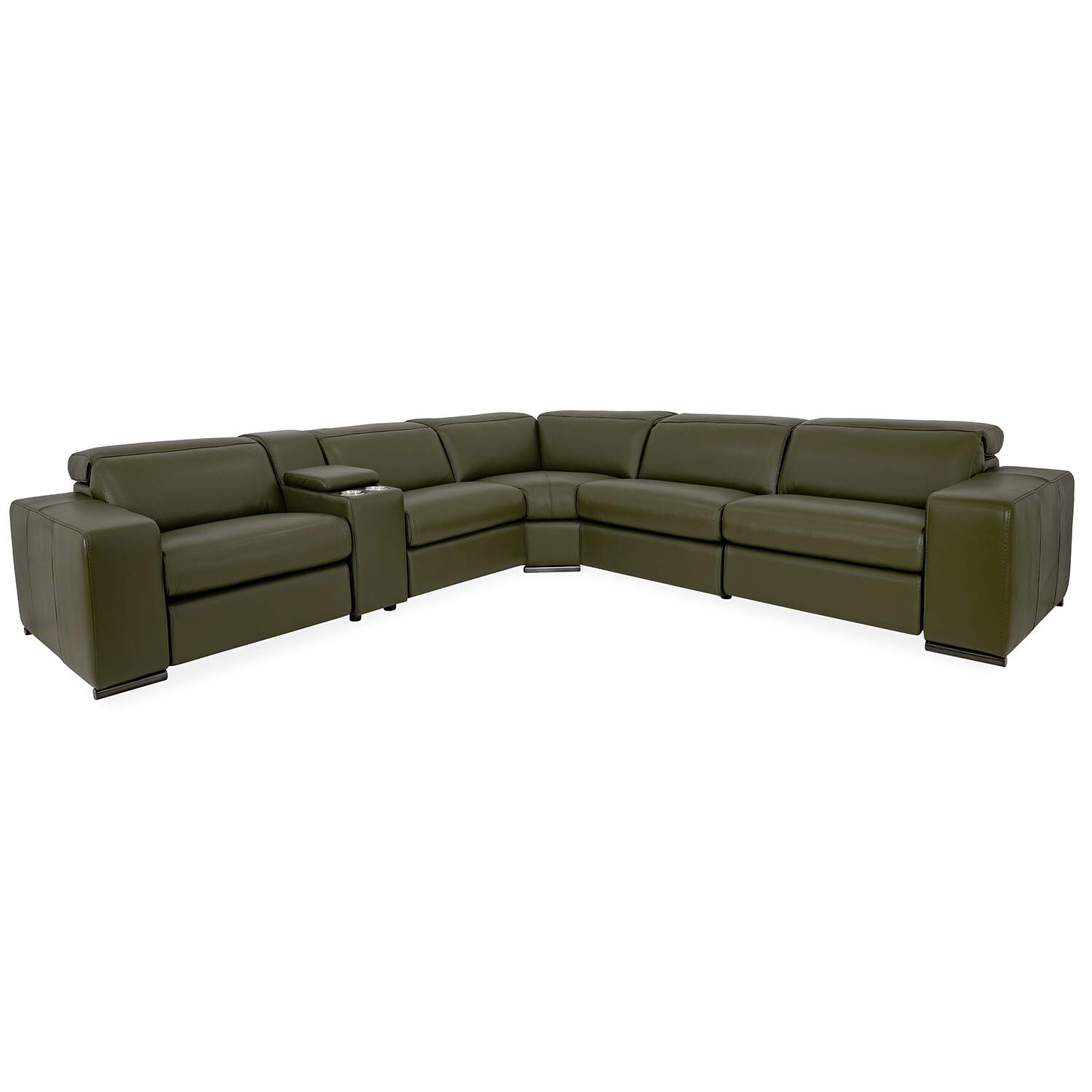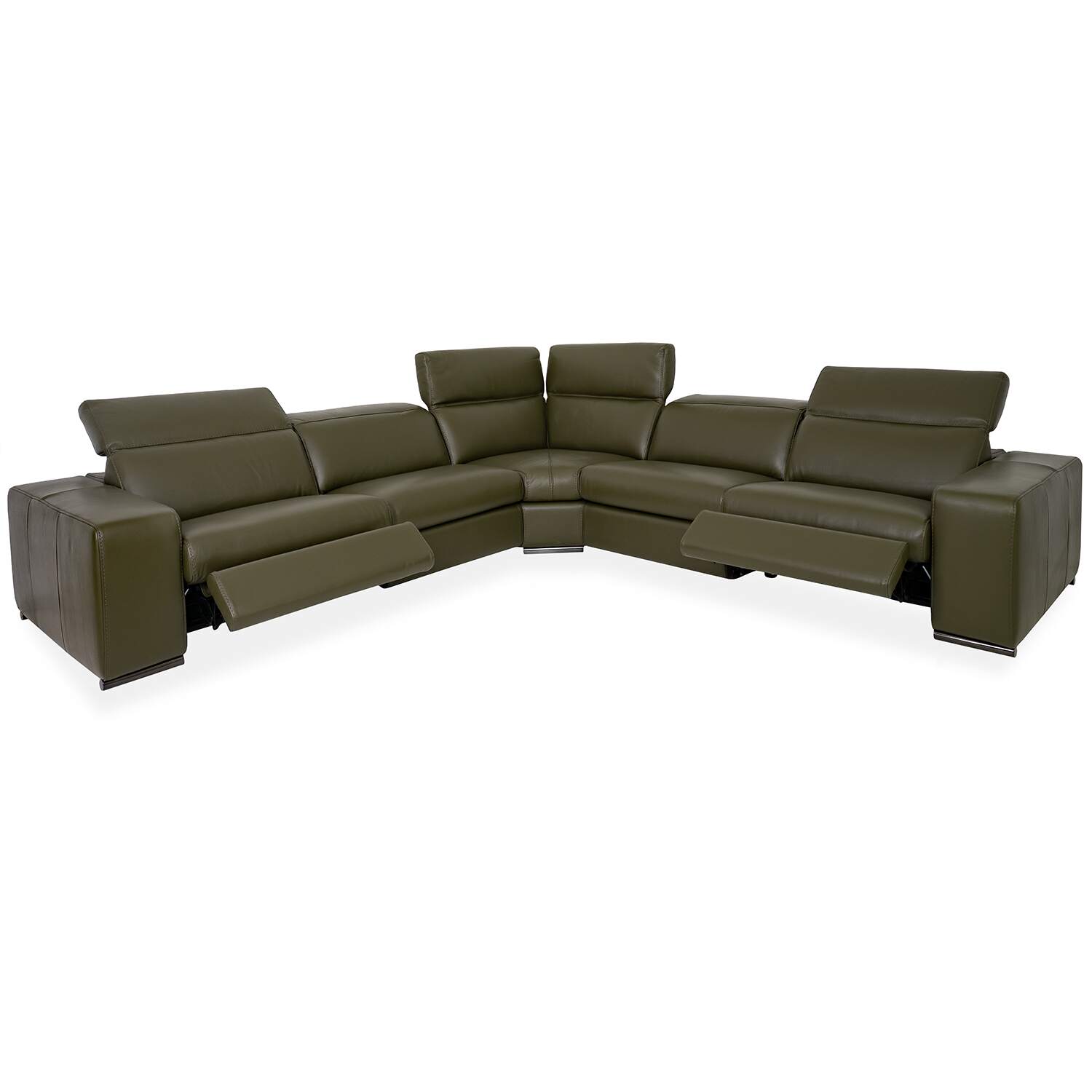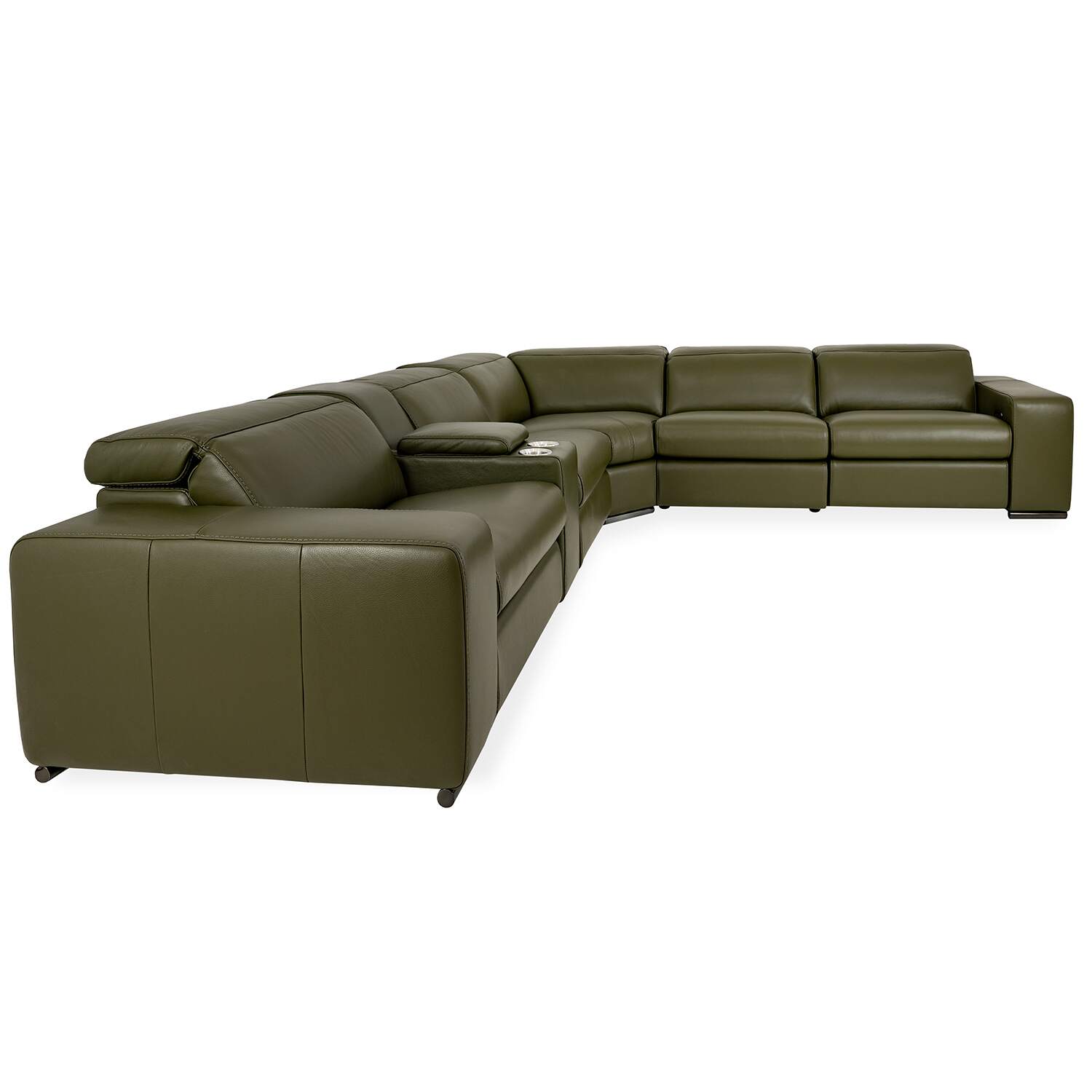The Lianne Sectional, available in dark olive green Giotto leather, features power motion technology and crisp, clean style, with five wide seats that provide ample room to stretch out and lounge. Three of the seats are equipped with dual power motion, which adjusts the headrest, leg rest, and back angle to your ideal level of comfort at the touch of a button. The power panels also include USB-C charging ports for added convenience. Enhance your living room and make Lianne your favorite place to sit, socialize, or relax.