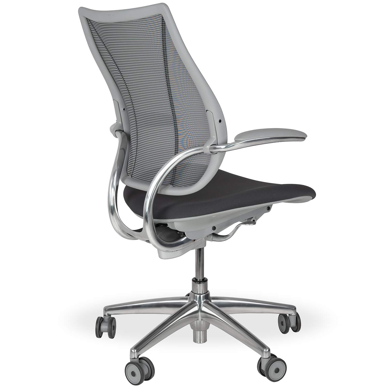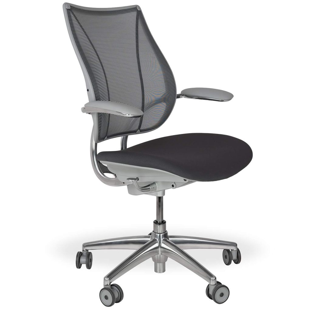 The Liberty Task Chair is designed by Niels Diffrient (considered the father of ergonomics), with a wealth of adaptive features to give you effortless comfort through your workday. Move smoothly from one position to another with the weight-sensitive recline function and easily adjust the height and seat depth to match your body proportions. Liberty's backrest is made of Form-Sensing Mesh in monofilament grey stripe, with a flexible tri-panel construction that adapts to the shape of your back. Other ergonomic features include a foam seat in dark grey fabric with four-way stretch, Duron armrests that are 5X tougher than standard arms, and a sleek aluminum frame with a rolling caster base. Liberty is also sustainably made, with the goal to not only minimize carbon footprint but also create a positive impact on the environment.