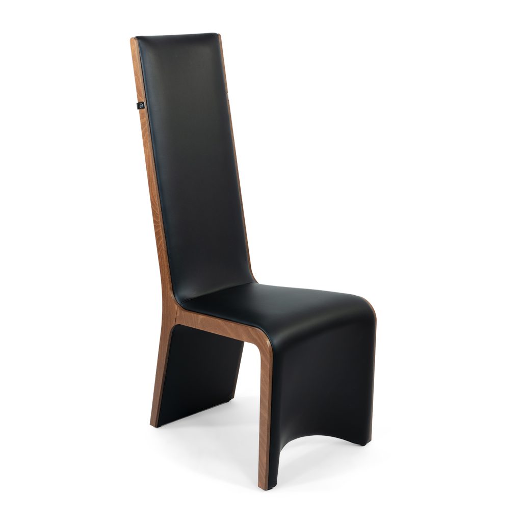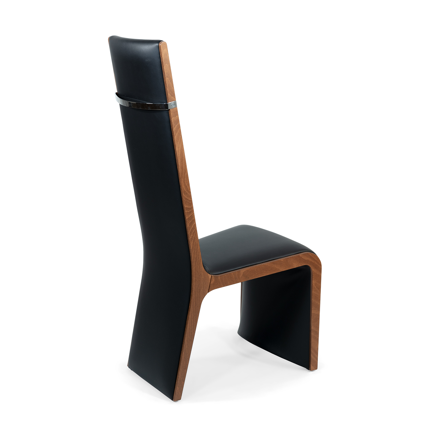 [0] => The Light Dining Chair, made in Italy, features edgy, sophisticated design that accents any contemporary setting. With a matte walnut base and black ecopelle grade upholstery, this chair has an innovative appeal, with a fluid transition from back to seat to legs. Its intriguing curves are visually striking and comfortable for the body.