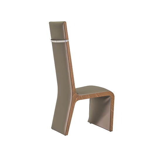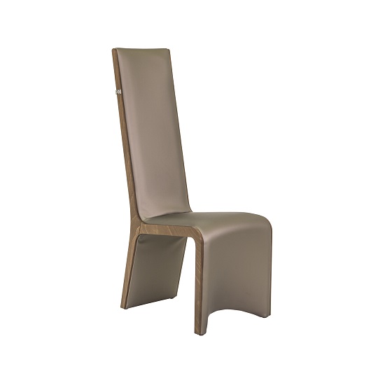 [0] => The Light dining chair, designed by Giorgio Soressi and manufactured in Italy, features high-quality, eye-catching materials and edgy contemporary design. The chair's taupe vinyl upholstery, walnut matte frame, and silver metal accent give the chair a sleek, futuristic appeal that enables it to add sophistication and style to its surroundings.