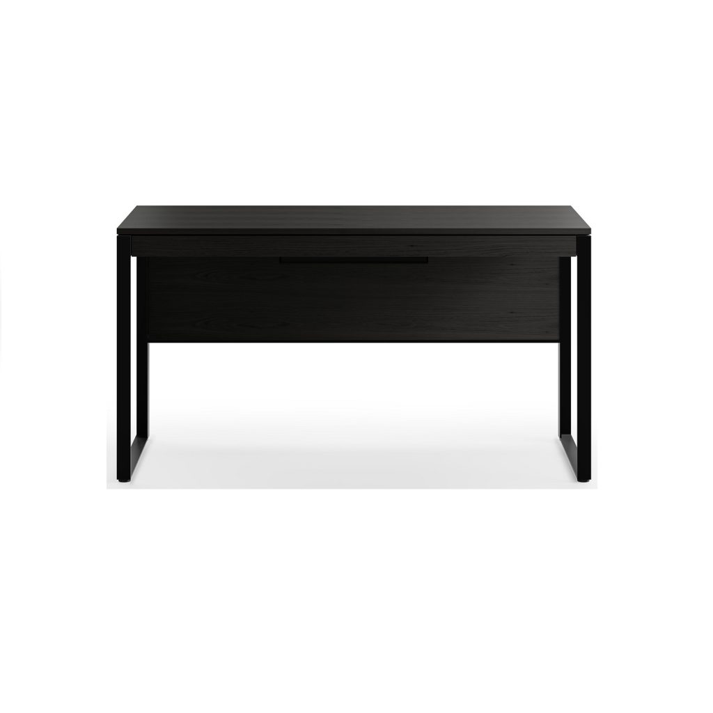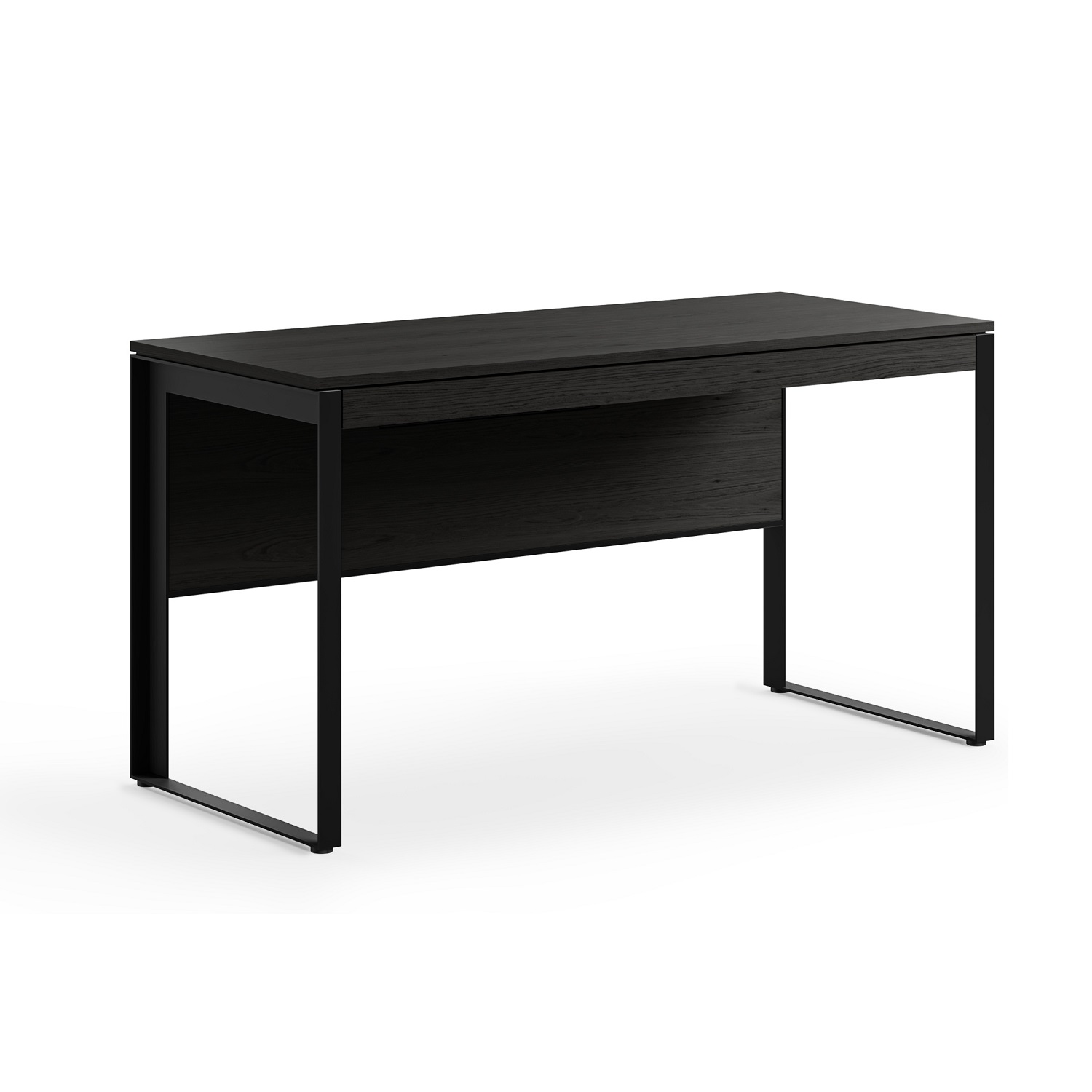 Shown in a charcoal-stained ash hardwood veneer with a powder-coated steel frame. The modesty panel on the front is finished with the same detail to allow the desk to be placed anywhere in a room.
