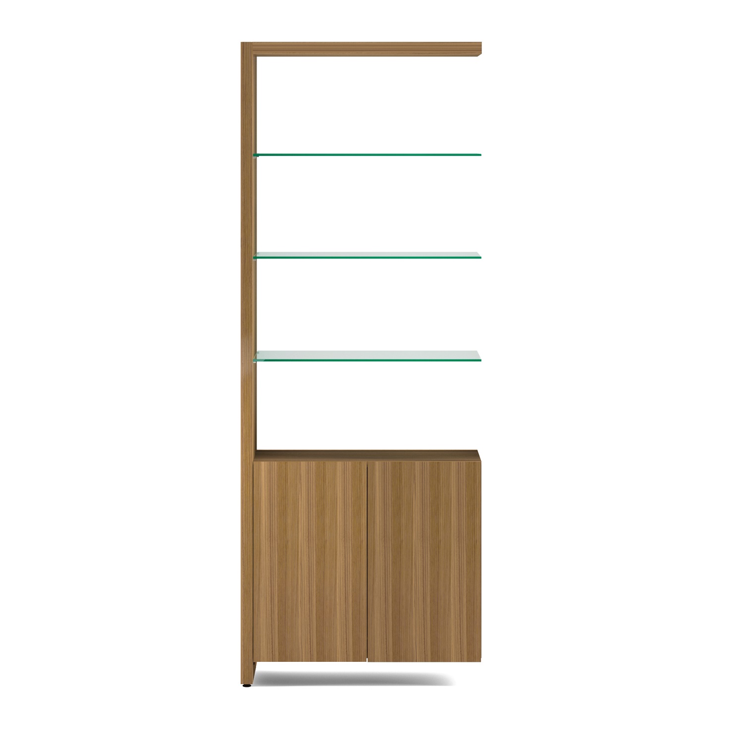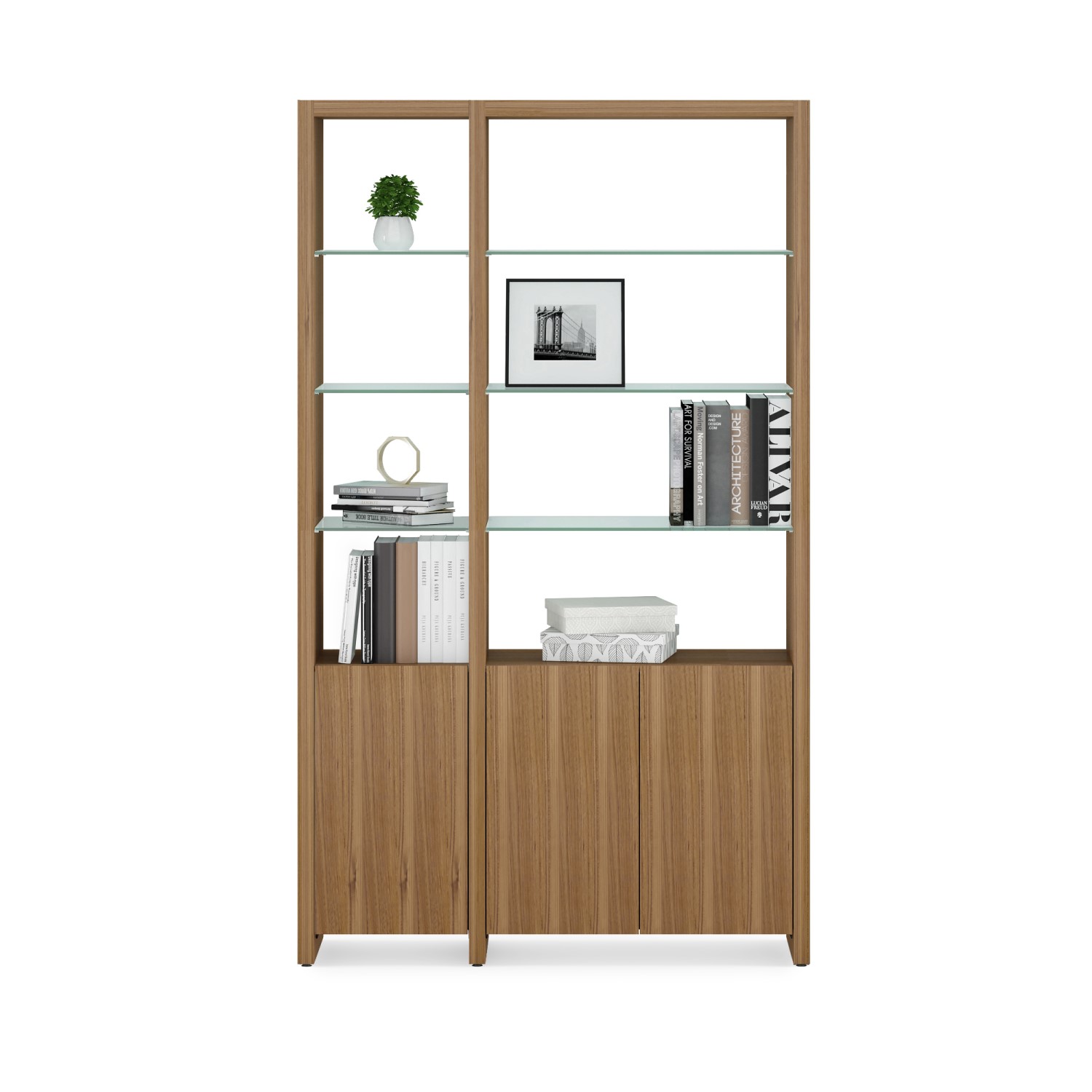 [0] => With a sleek design, a rich natural walnut hardwood veneer, and plenty of room for your books, knickknacks, and other treasured objects, the Linea Double Add-On Shelf is part of the perfect storage solution for your living or office area. Three tempered glass shelves provide open storage, while the cabinet contains one tempered glass shelf and a cutout on the bottom to provide concealed cable management. The Linea Double Add-On Shelf must be purchased alongside the Linea Single Shelf and cannot be displayed on its own.