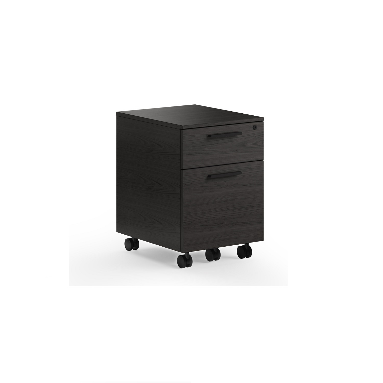[0] => The Linea Mobile File Pedestal is the perfect accompaniment to any office setup. Its size and mobility allow it to tuck under the Linea Desk, function as a printing station, or sit standalone wherever you need some extra storage. A smaller supply drawer provides space for essentials, and the larger file drawer's adjustable filing system can store Legal, Letter, A4, and Foolscap size hanging folders. The locking wheels ensure the pedestal will stay in place, and the drawer key lock keeps files secure. Shown in charcoal-stained ash hardwood veneer.