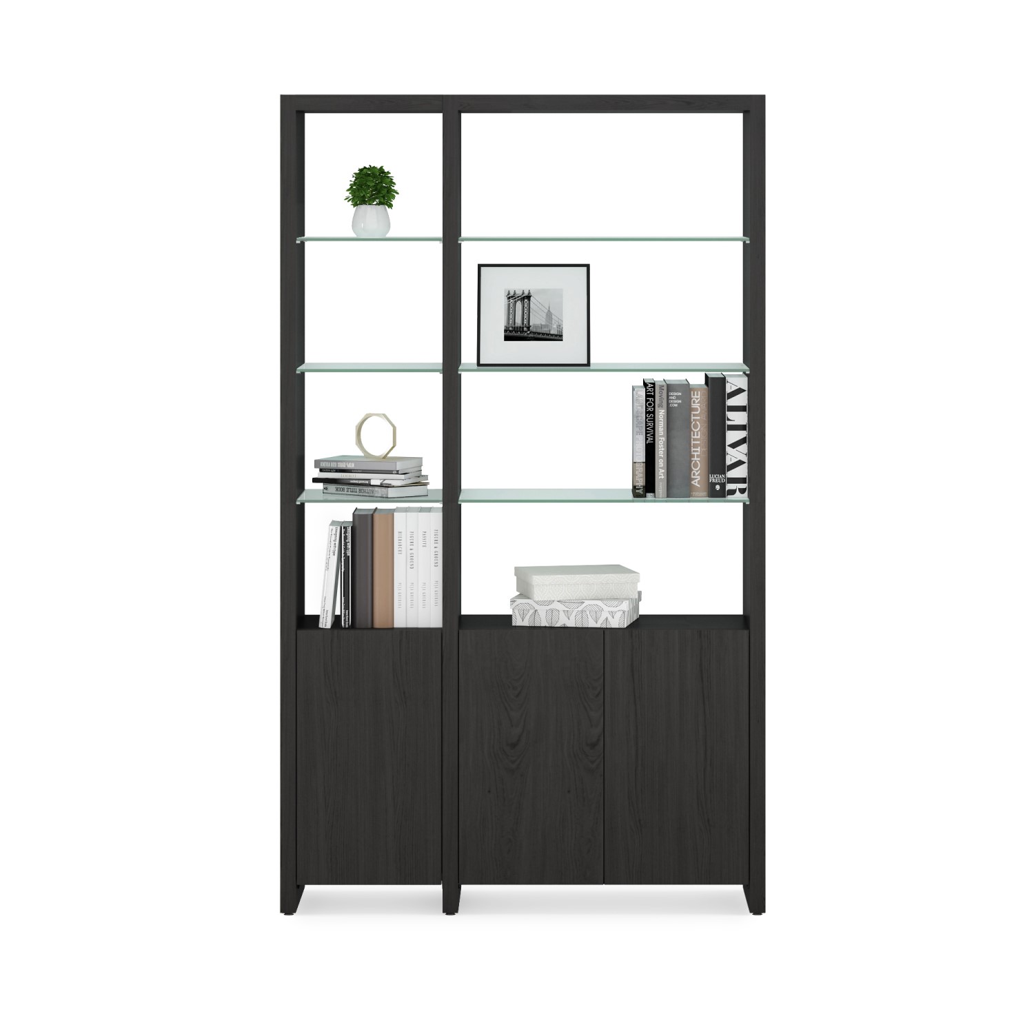 With a sleek design, rich charcoal-stained ash hardwood veneer, and plenty of room for your books and knickknacks, the Linea Single Shelf is the perfect storage solution for your living or office area. Three polished tempered glass shelves provide open storage, while the cabinet features soft-close doors and contains one adjustable tempered glass shelf and a cutout on the bottom to provide concealed cable management.