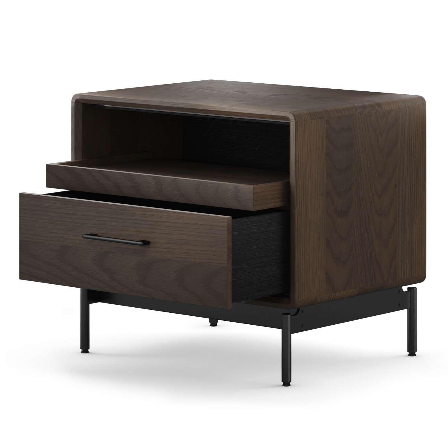 Linq is more than just tech-savvy -- it's elegantly and smartly designed as well. An open compartment with a pull-out tray offers the perfect place to put books and devices, while a textured lower drawer with a soft-close mechanism stores your belongings in style. Linq's mocha veneer and rounded corners evoke mid-century modern design, while a black steel base with adjustable levelers help it stand securely on any floor. Pair the Linq 28" Side Table with other items in the Linq collection for a beautifully streamlined home.