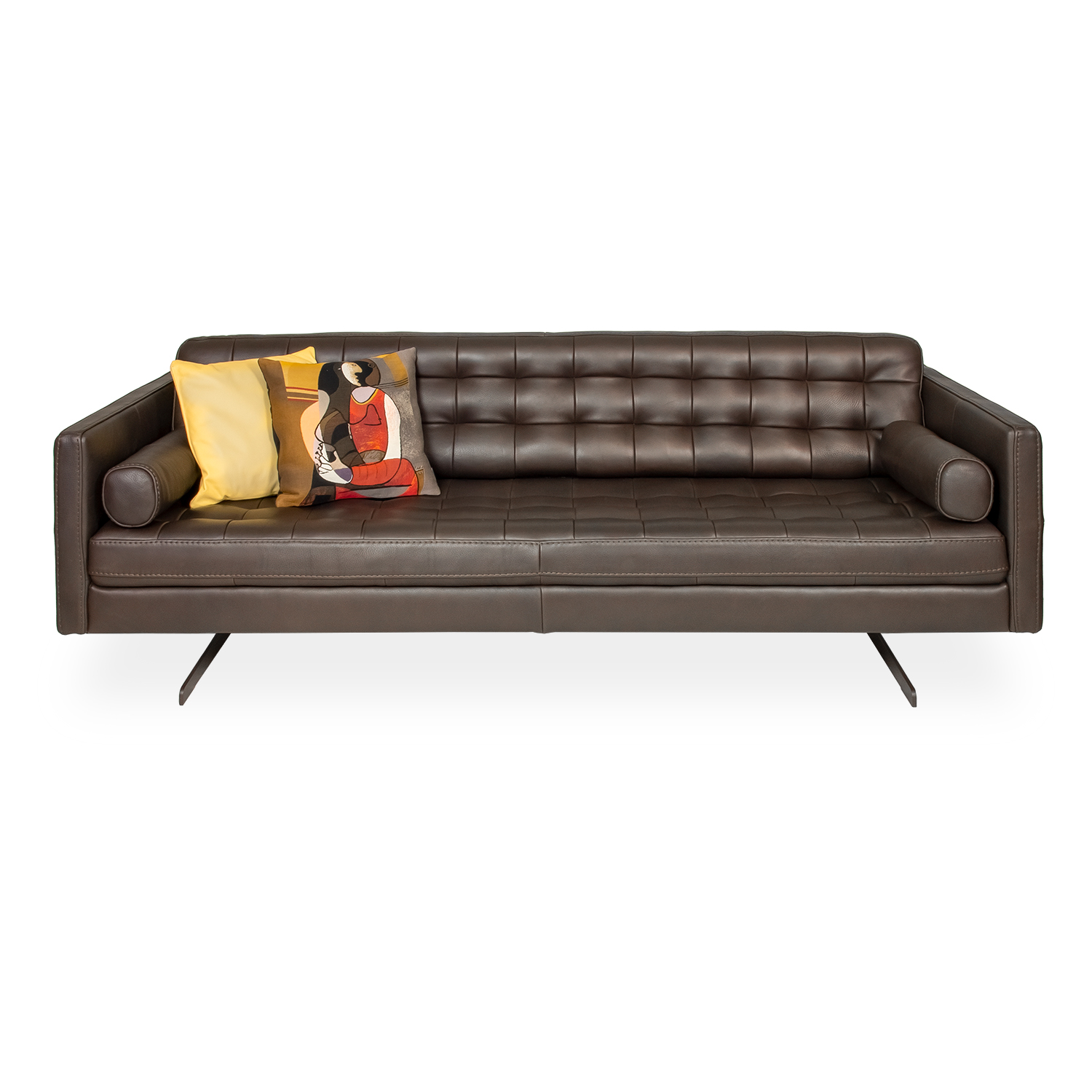Chic and cosmopolitan, the Lodi Sofa by Incanto Italia will be an instant conversation piece at parties and gatherings. This sofa features an elongated look and dramatic tufted stitching on the seat, back, and sides. It's upholstered in luxurious Callas dark brown leather with a buttery feel and stands on brushed steel legs. Two included rollo cushions add an extra style accent. The Lodi truly exudes elegance and flair with every detail.