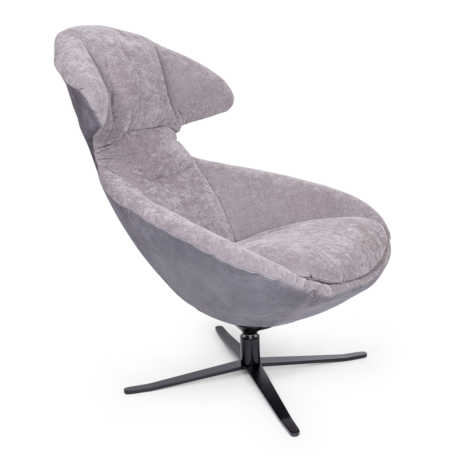 [0] => loft soft loungechair with swivel return and recline, outside shell in savana 967 dark grey leather with inside seat and back in stropiccio 2a7 grey favbric, matt black base. design by markus kerker