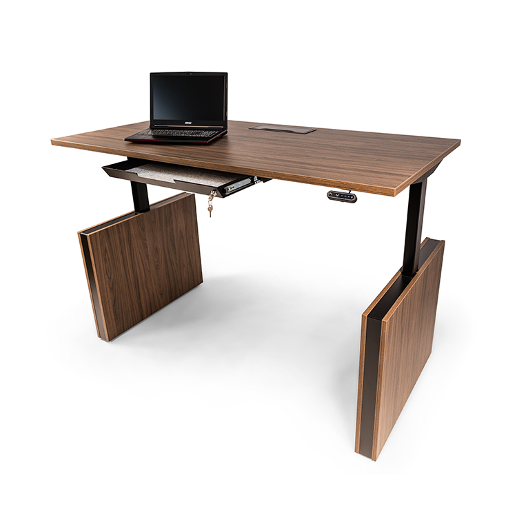 [0] => Work more comfortably and productively with the Lofte Sit/Stand Desk and keep your mind and body stimulated throughout the workday. At the touch of a button, Lofte adjusts to the perfect height via an electronically powered leg system that is discretely concealed by the design of the frame when the desk is at its lowest setting. The desktop is finished with dark walnut melamine and adjusts in height from 27.5'' - 48''. Keyboard tray sold separately.