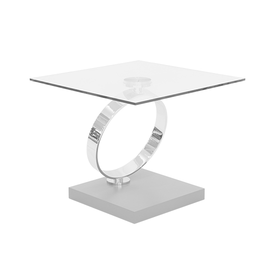 [0] => The Donelli Loop End Table has a unique design characterized by its circular chrome leg. Featuring a clear glass top, this table is adjustable, and the leg moves along with the tabletop, allowing you to adapt its configuration to suit your living needs. A stone-grey base complements the smooth chrome.
