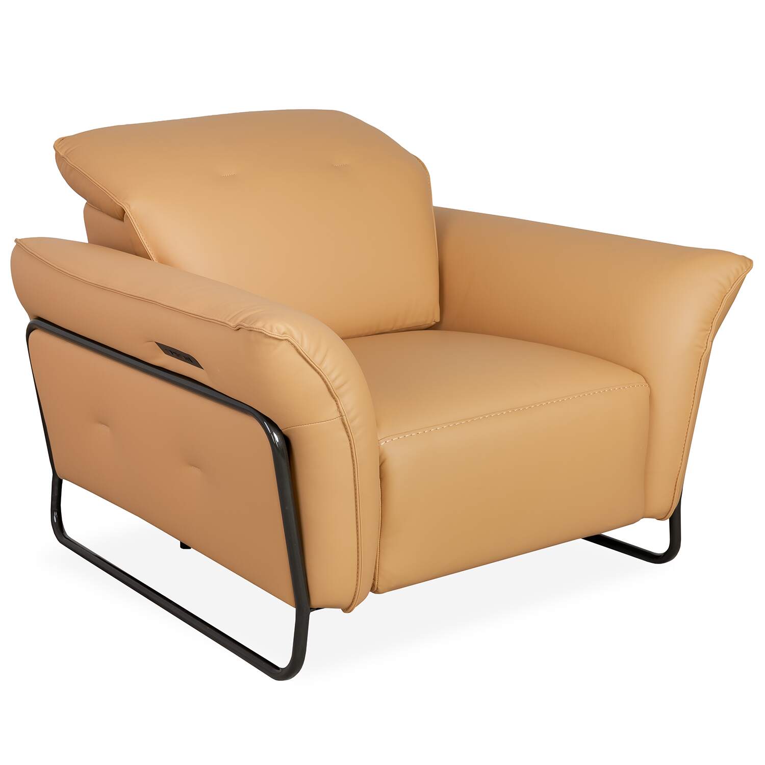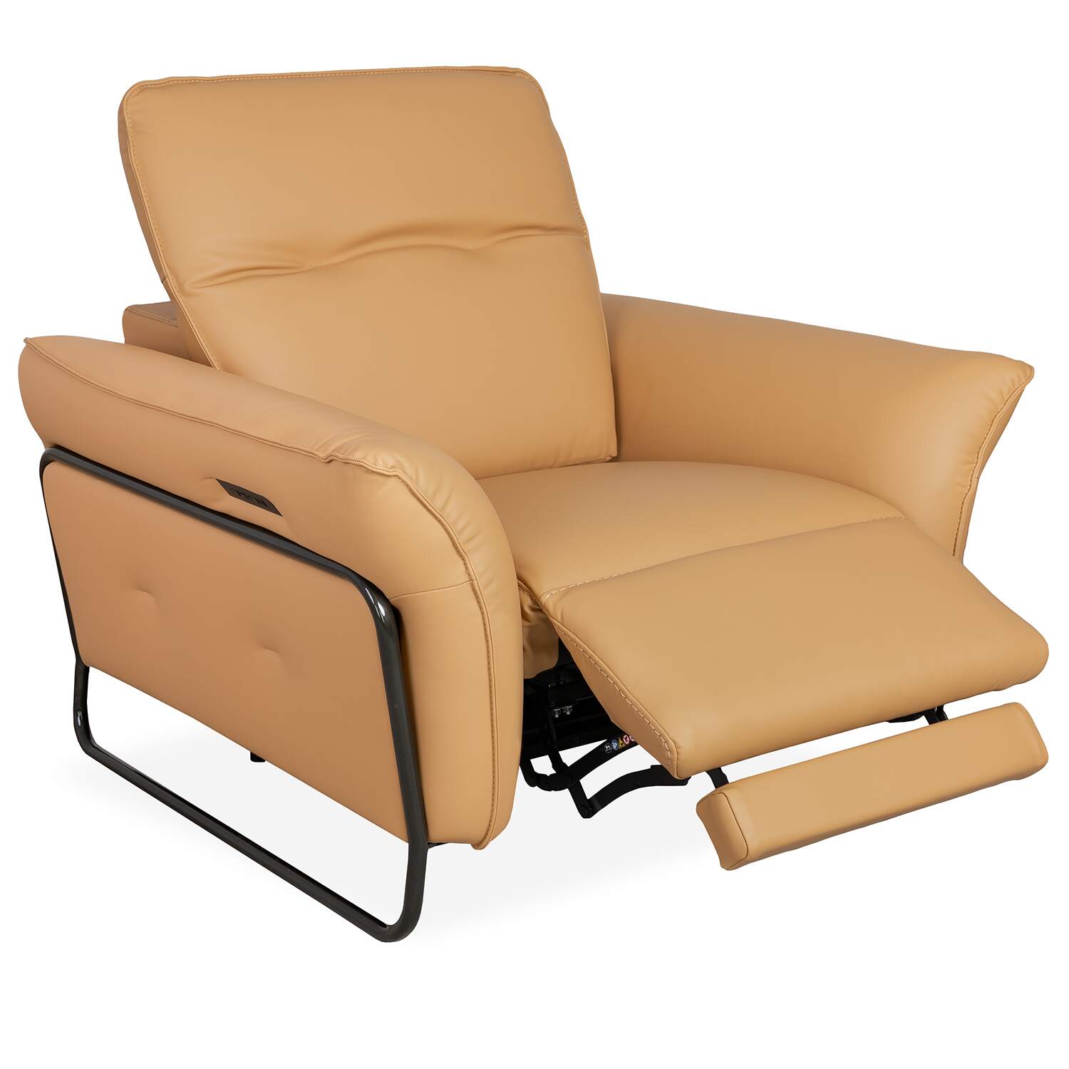 Made in Italy, the Lorenzo Power Chair fuses retro flair with modern technology. Lorenzo is upholstered in warm yellow leather that will add a burst of cheer to any space, and supported by rounded, rectangular black legs. A wide seat and flared armrests invite you to relax, while tufted stitches on the backrest and sides add a charming accent. Lorenzo's power motion controls allow you to individually adjust the footrest and headrest, with USB-A/C ports letting you charge devices with ease.
