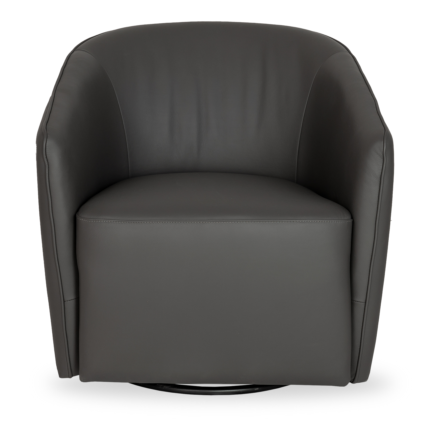 Take your relaxation to a whole new level with the Lotus Swivel Glider Chair, available with dark grey leather upholstery. Lotus' minimalist, structured look is softened by a rounded frame and sloped arms that subtly envelop the body. This chair adapts to a variety of design environments as well as to the movement of the sitter, thanks to its 360-degree swivel function and soothing gliding motion.