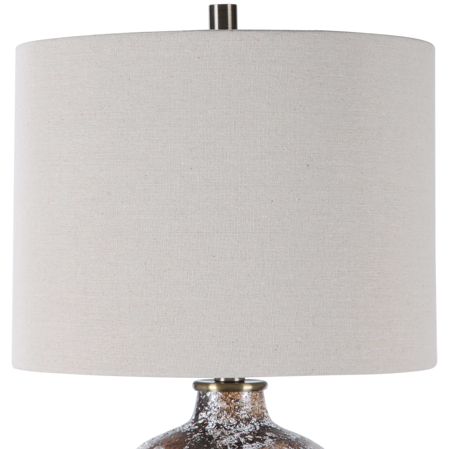 [0] => Rustic and appealing, the Luanda Table Lamp features a textured ceramic base in a mottled white finish, and round hardback drum shade. Aged chocolate bronze and brown accent the base, with antique brass plated details highlighting the subtle warmth of the beige linen fabric shade.