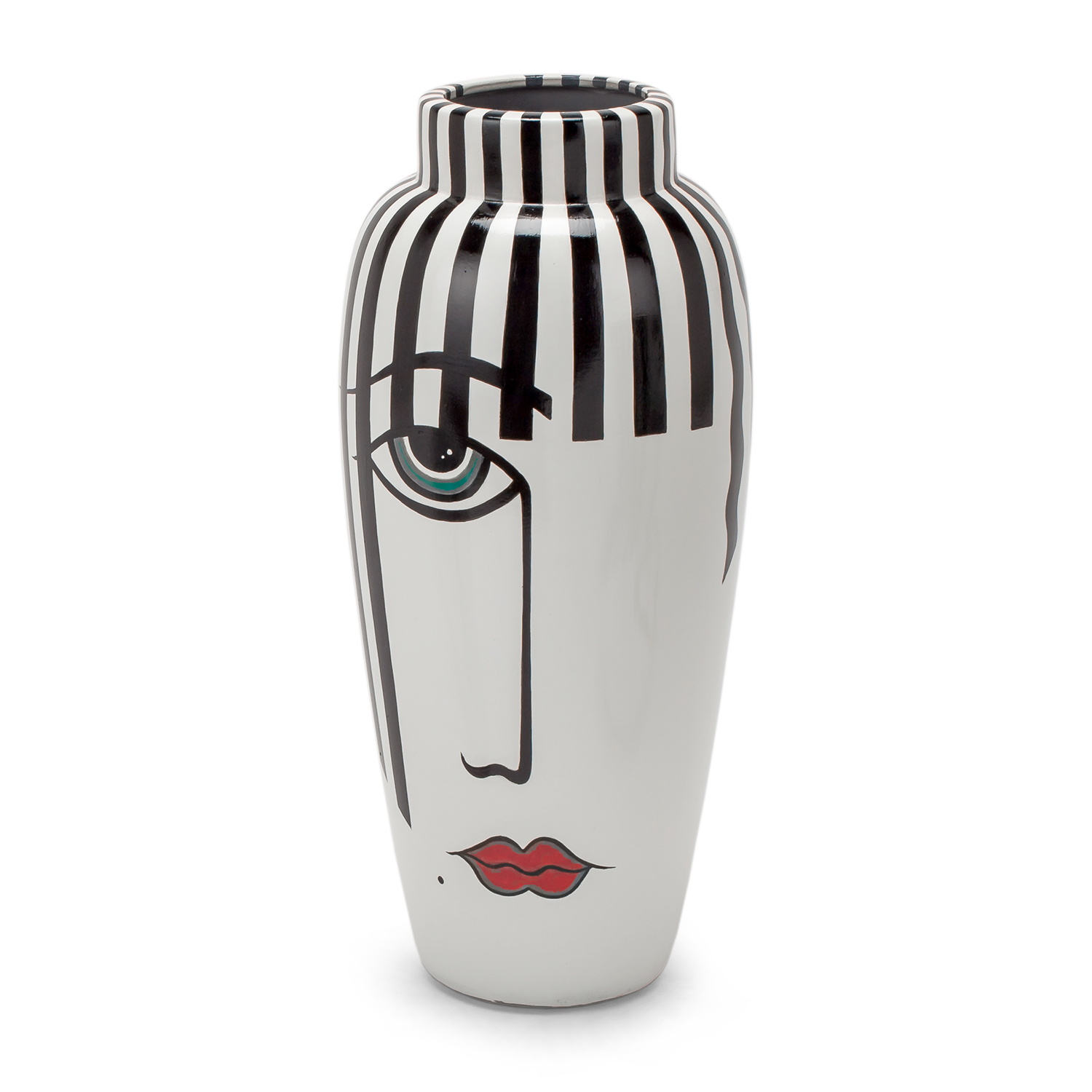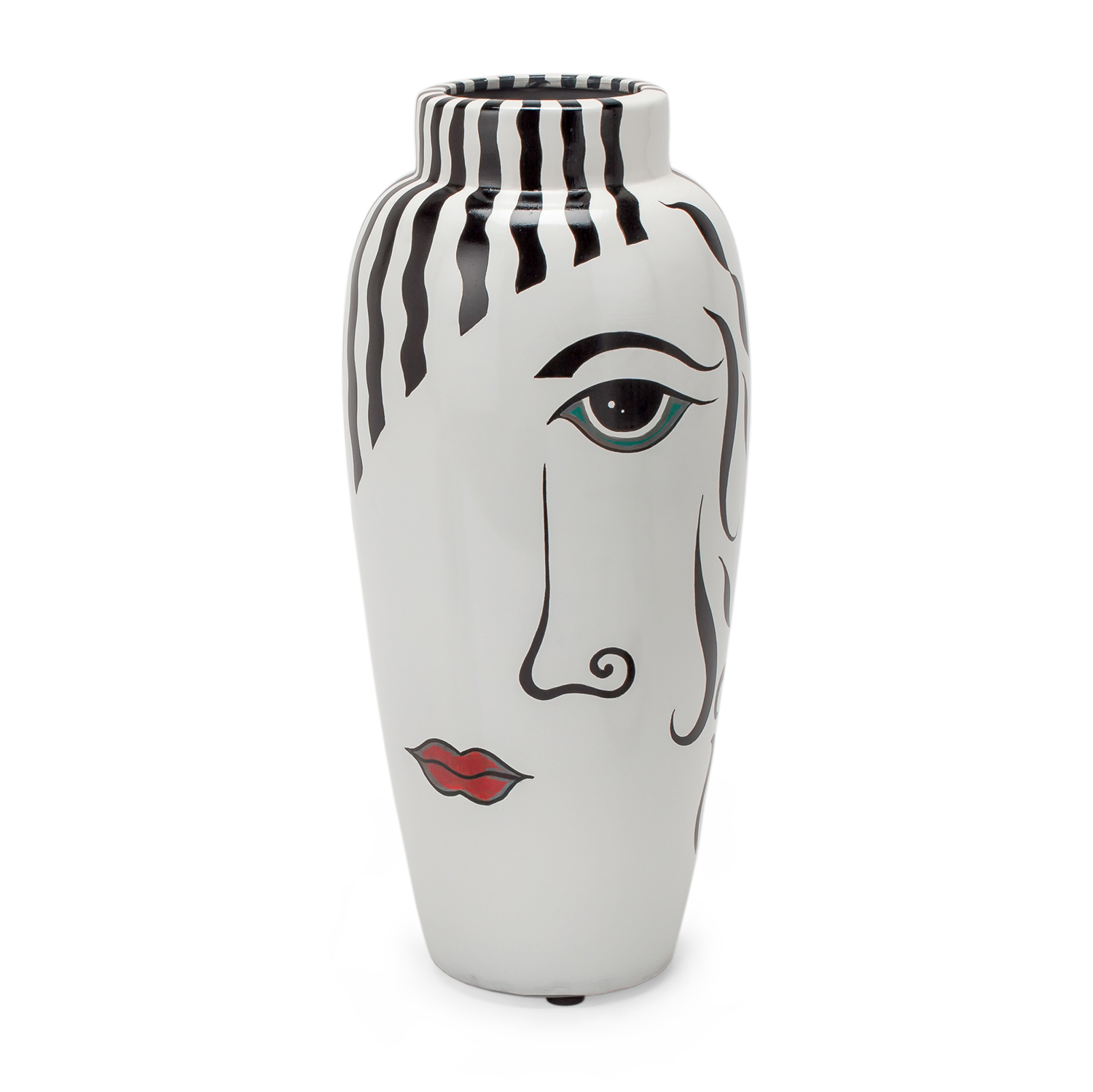 The Luciana Tall Vase features a dramatic design, with hand-painted black lines and bright red and blue coloring creating the abstract image of a face. The vase's gently curved silhouette highlights the angular lines and bold brush strokes of the design. Luciana will add personality and chic style to any living space.