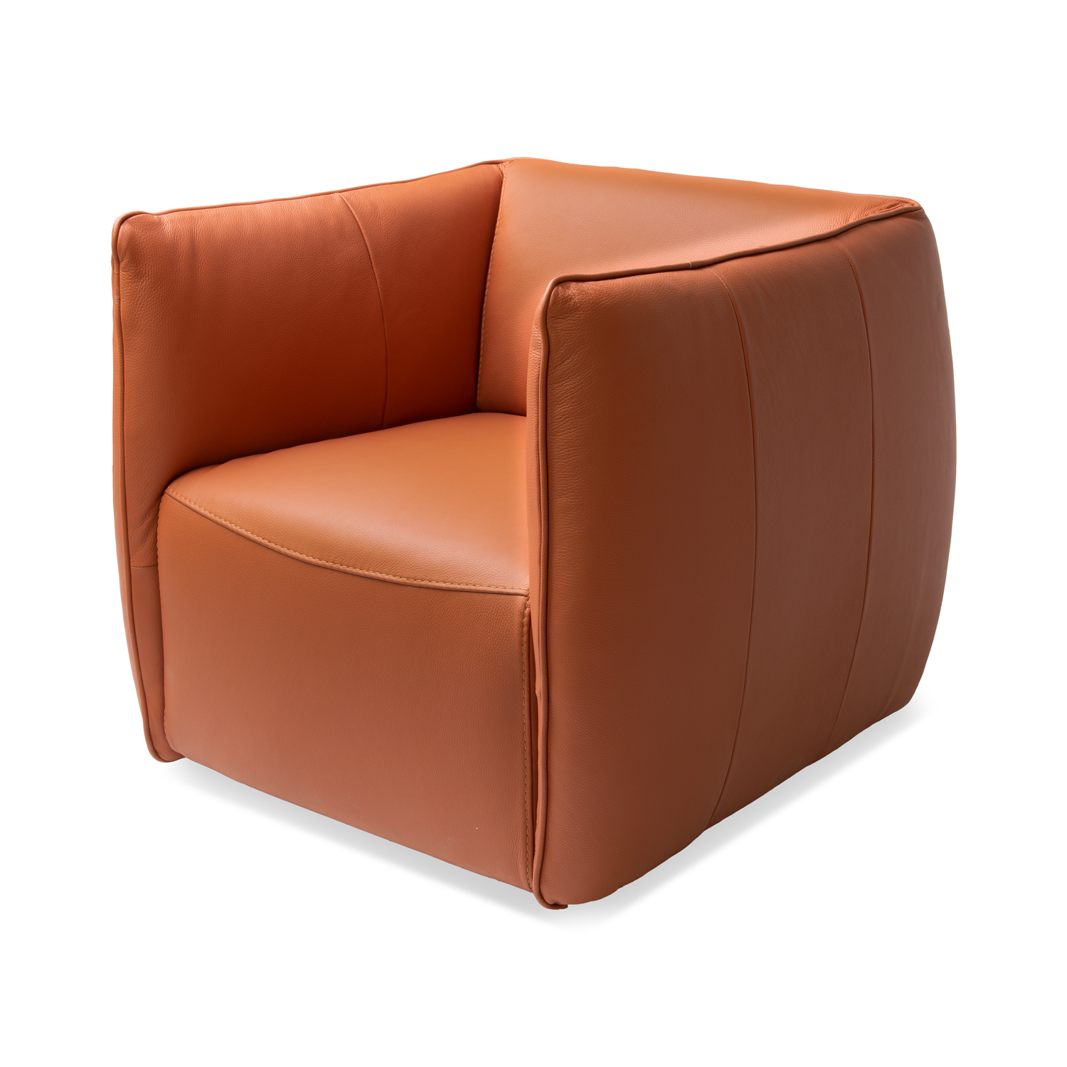 The Ludo Swivel Club Chair has a compact contemporary design with a 360-degree swivel base. Crafted in Italy, this chair makes a dramatic statement with its cubic shape, high arms, and plush look. Ludo is upholstered in light brown leather with matching accent piping to seat you in style.