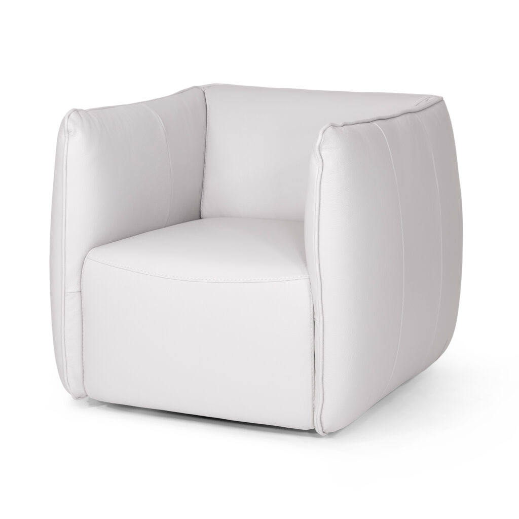 The Ludo Swivel Club Chair has a compact contemporary design with a 360-degree swivel base. Crafted in Italy, this chair makes a dramatic statement with its cubic shape, high arms, and plush look. Ludo is upholstered in light grey leather with matching accent piping to seat you in style.