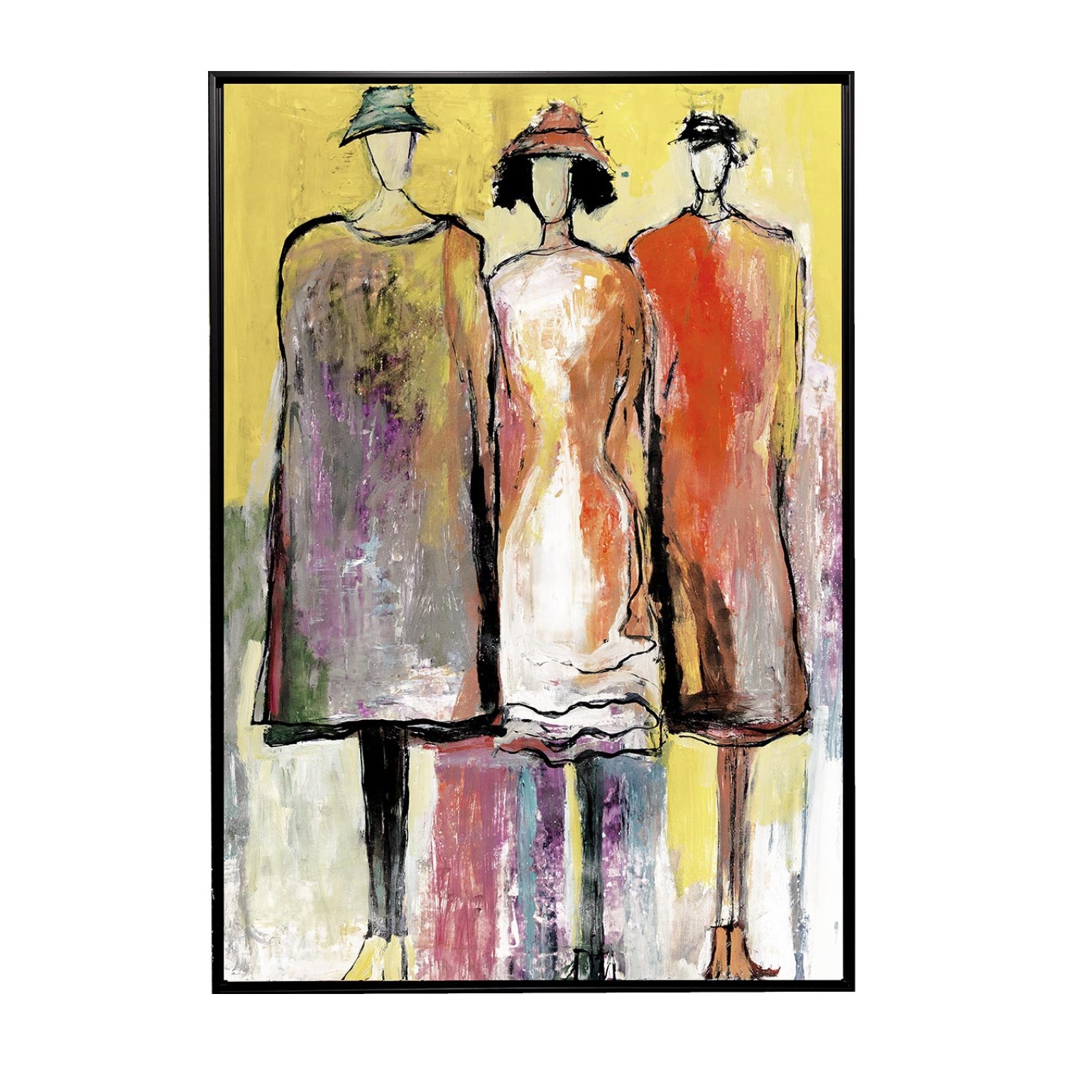 The Lully and Company Wall Art, by artist V. Klauss, is a vibrant abstract portrait on canvas with a black frame. Three figures painted side-by-side fill the canvas, and their overexaggerated silhouettes play with shape and color. Lully and Company will bring bright, lively hues into any living or office space.