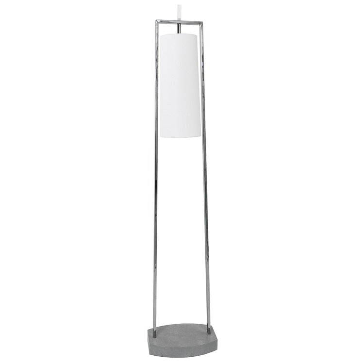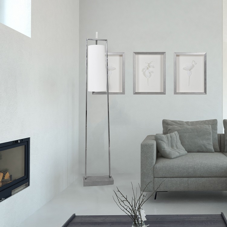 The Luxe floor lamp, available with a chrome and grey finish, is an elegant floor lamp with clean, strong lines and a crisp white shade. The Luxe has an elegance that pairs well with a variety of design environments. The lamp has a floor dimmer.