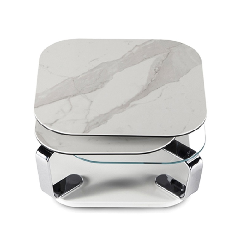[2] => The table is available with two statuario ceramic tops and two natural glass tops. The table base is white, and the supports are chrome.