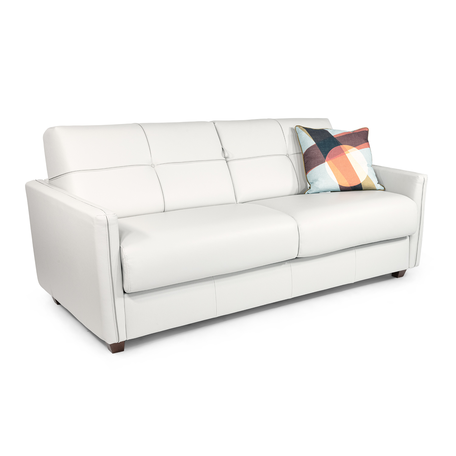 The Magic Maxi Sleeper Sofa, made in Italy, brings tailored yet comfortable style to your bedroom, office, or guest room with its detailed stitching patterns that emphasize the off-white romagna leather accents across the backrests and arms. With a simple pull-open mechanism, this piece transforms easily from a wide, firm sofa to a plush bed. Relax comfortably onto the memoflex mattress, which is made with breatheable 3D fabric and has a 1'' layer of memory foam that adds just the right amount of comfort and firmness. Pillow compartments are built into the backrest as the sleeper unfolds.