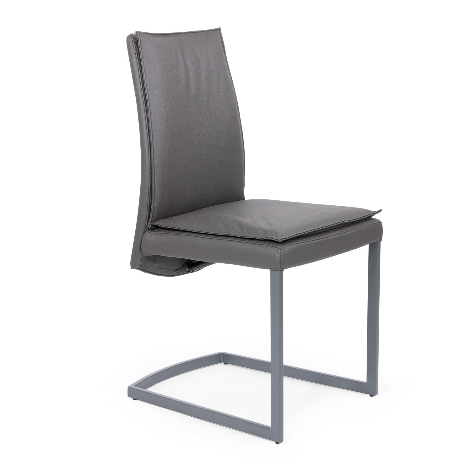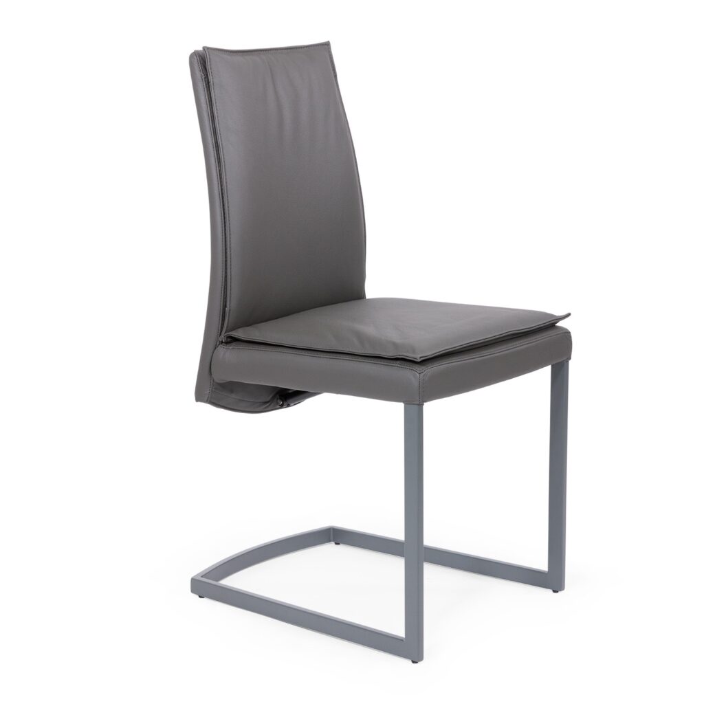[0] => The Manta Dining Chair, available with an anthracite powder-coated frame, features grey leather upholstery with matching stitching, and thick cushion support on the back and seat to increase your comfort in the seated position. The curves of the sled base complement the rounded seat back, which drapes elegantly below the seat.