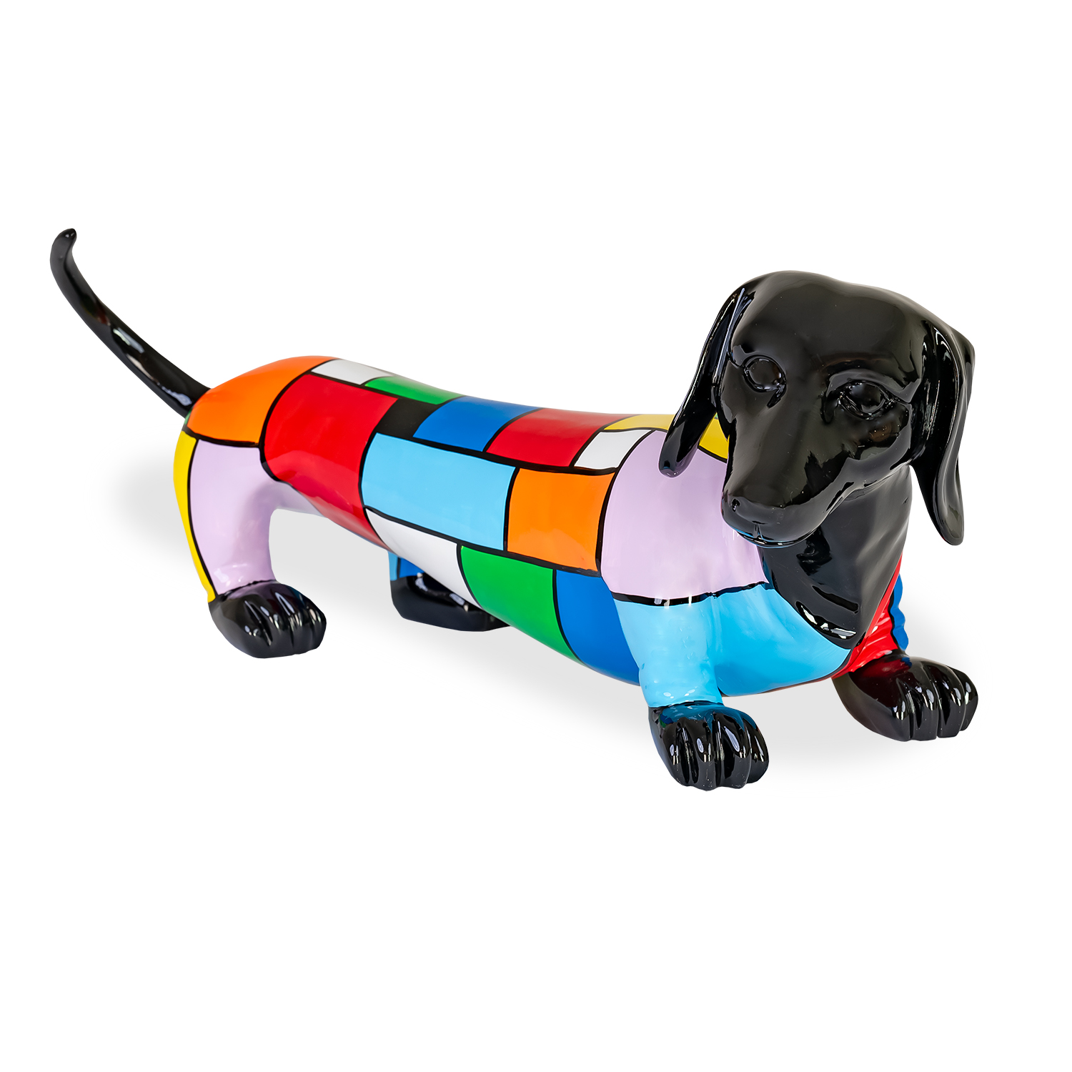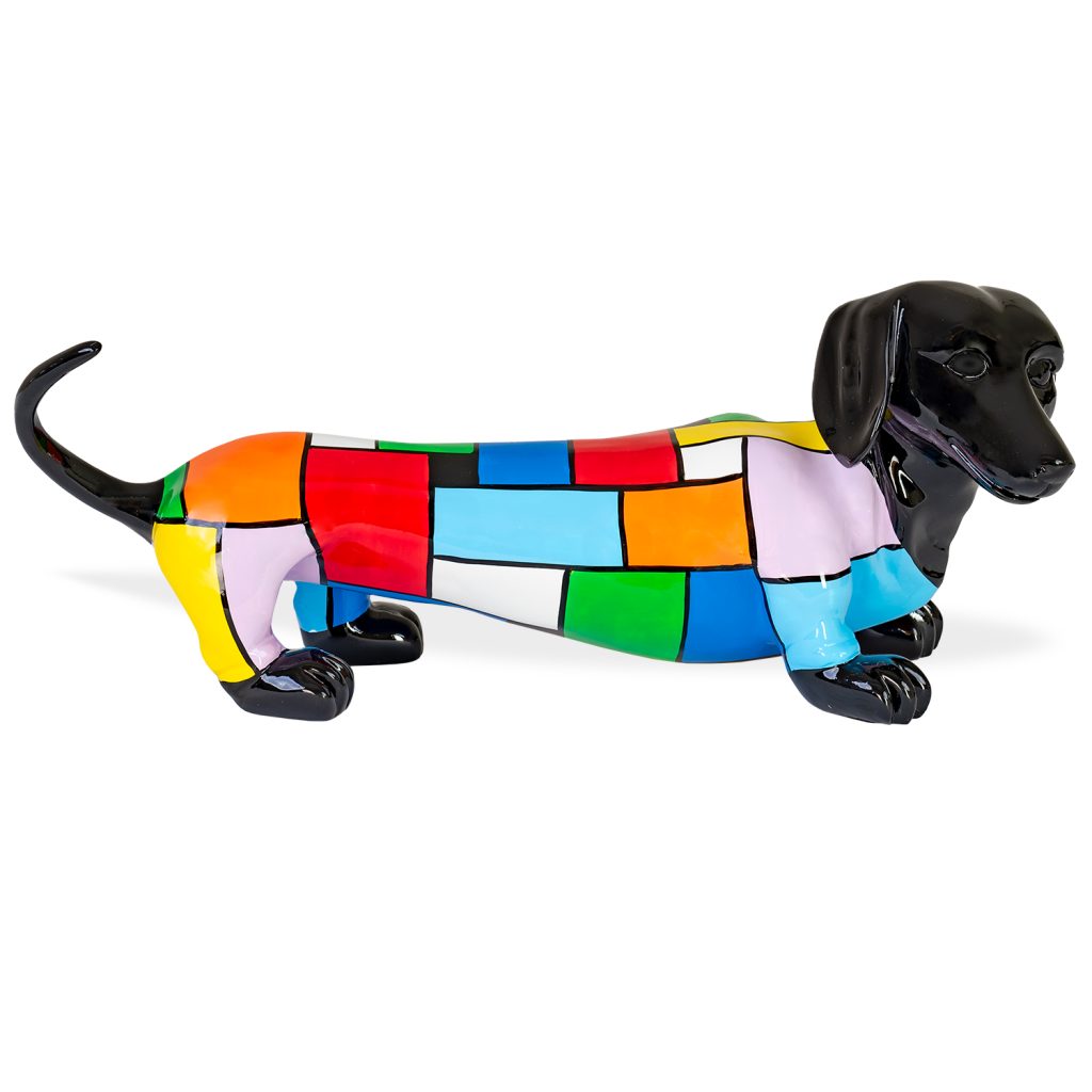 The Manuela's Dog Sculpture depicts a black dachshund with its tail up and head slightly cocked. The dachshund's torso is decorated with a rainbow of colorblock rectangles in red, orange, yellow, green, blue, purple, and white. A perfect gift for lovers of both dogs and art, this polyresin sculpture will add a pop of color and fun to any table, sideboard, or shelf.