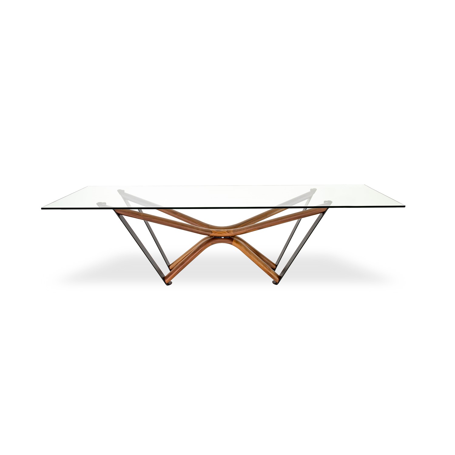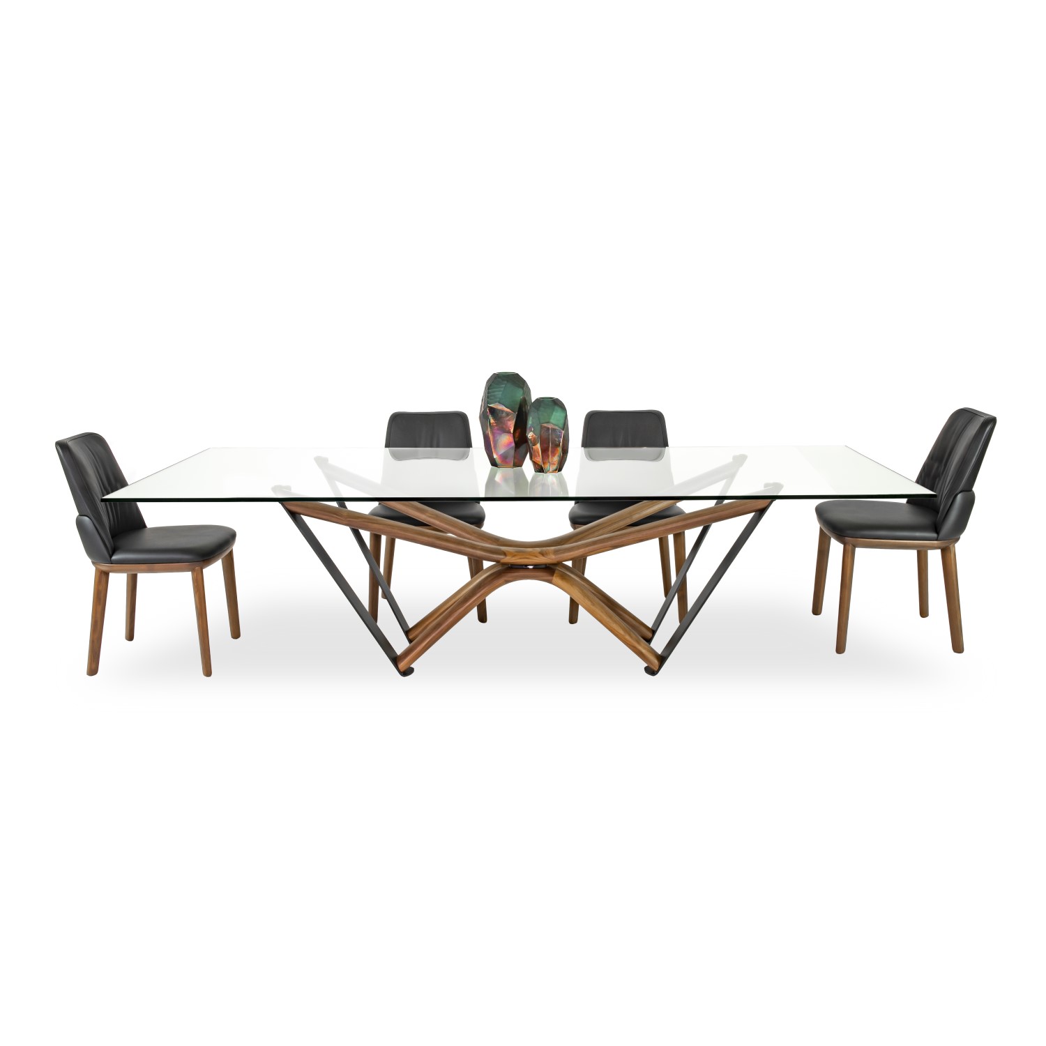 The Marathon Large Dining Table, made in Italy by Cattelan Italia, has a flowing sculptural design with a stunning base and beveled edges. The walnut base features a gently sloping W shape with angled black embossed accents -- a combination of wood and metal that results in a distinctive, elegant silhouette. This table is visually stunning at every angle.
