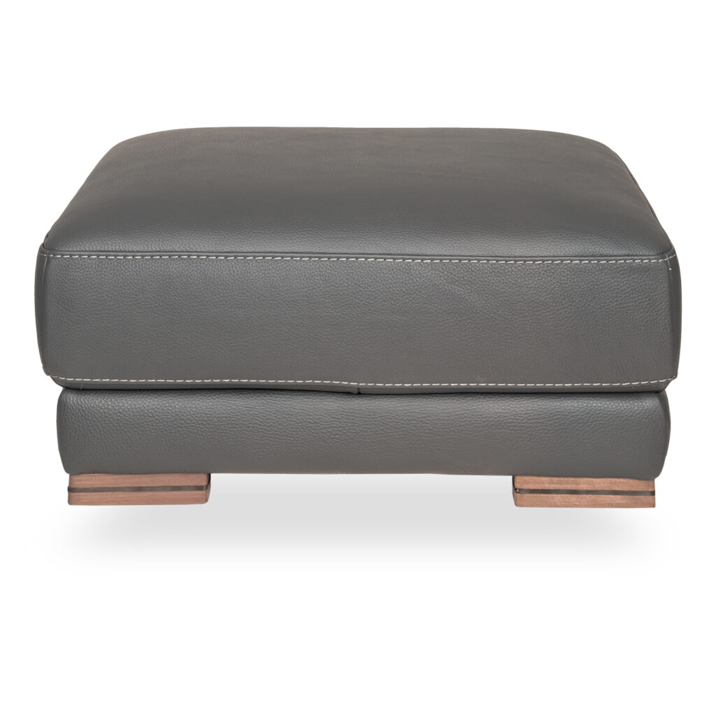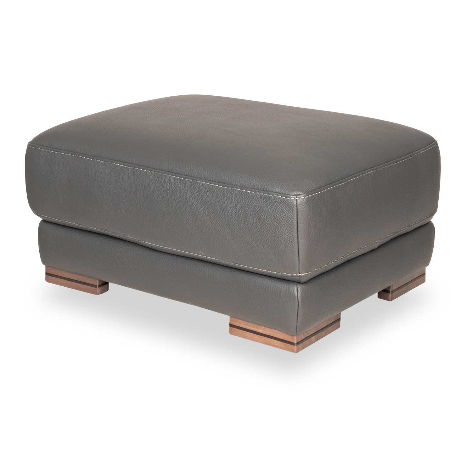 [0] => The Marco Ottoman, by Incanto Italia, will add a strong and stately presence to any living space. Upholstered in luxurious Mason dark grey leather, this ottoman features a generously-sized top with a bouncy feel, making it suitable as a footrest or as a seat. Contrast stitching in lighter grey adds visual interest, while wooden block feet with a metal stripe accent add sturdy support. You'll love putting your feet up on this ottoman to relax after a long day.