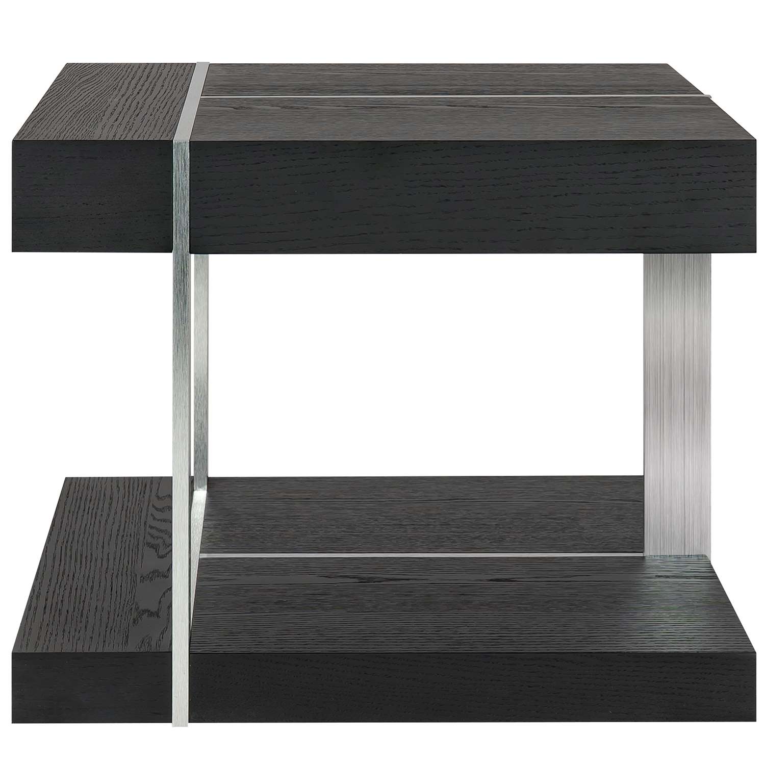 The Marconi End Table, available in black oak veneer, features a spacious tabletop and attractive linear mental accents that elegantly glide down the sides to connect the tabletops. The wide design of the frame is broken up by the thin, crisp metal, a combination of elements that results in a sleek, modern design.