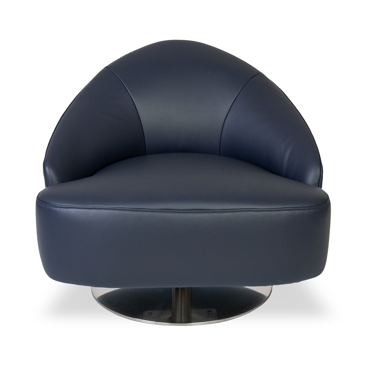 Upholstered in "magnet" dark blue leather with a rounded back, the Margot Swivel Chair features an elegant, modern silhouette with a wide, deep seat ideal for lounging. Accent stitching across Margot's backrest evokes the look of a shell, while a high-density foam filling, no-sag springs in the seat cushion, and a round stainless steel base provide support for effortless relaxation.