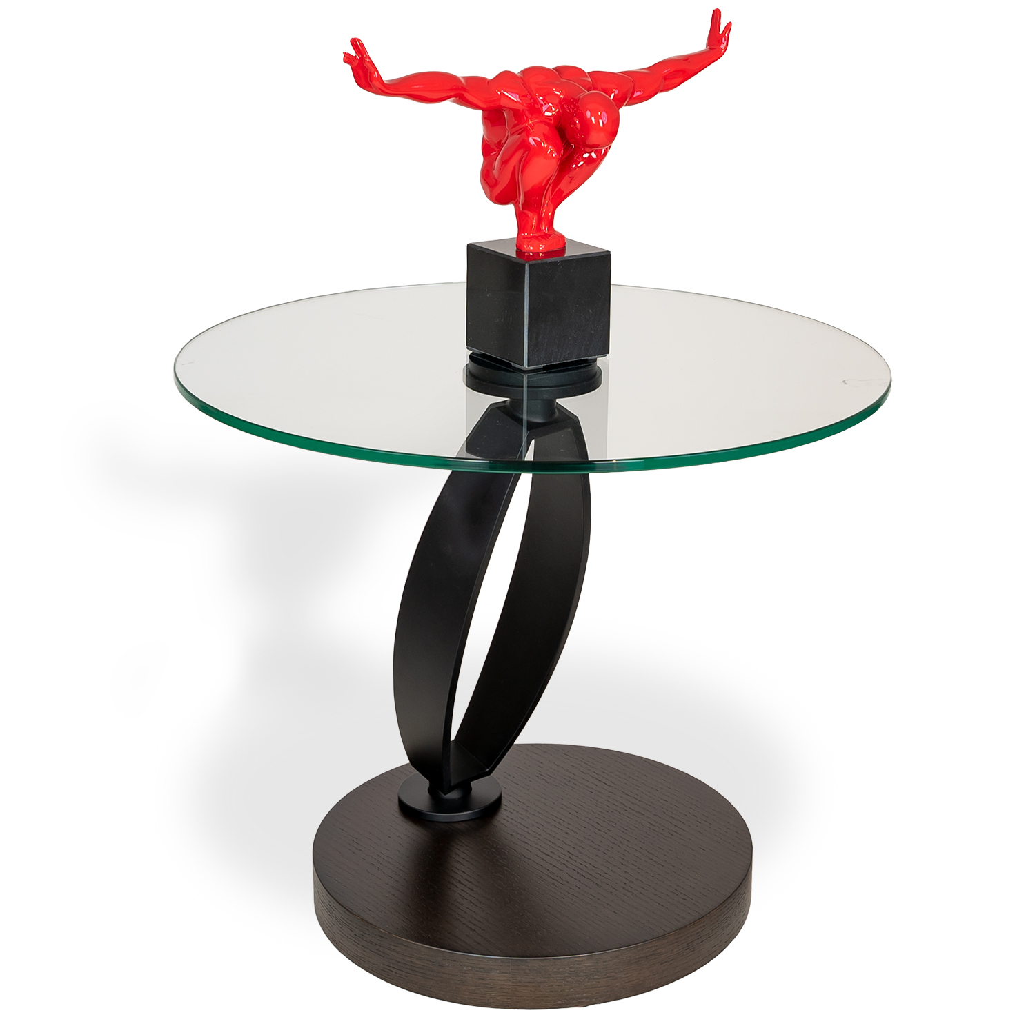 [0] => The Marino End Table is sleek and minimalist, with a black, ring-shaped leg, clear glass tabletop, and smoked oak base. The base's subtle woodgrain contrasts attractively with the matte finish of the ring, which is cleverly angled so that the tabletop can extend above a furniture arm or over your legs. This end table pairs perfectly with the Marino Coffee table for a contemporary look.
