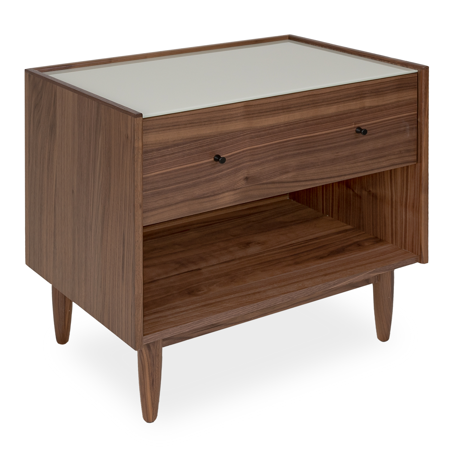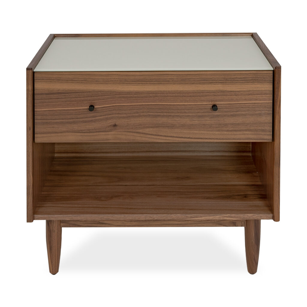 [0] => marvin one drawer nightstand in natural light walnut with cream 321 glass top, black anodized pulls.