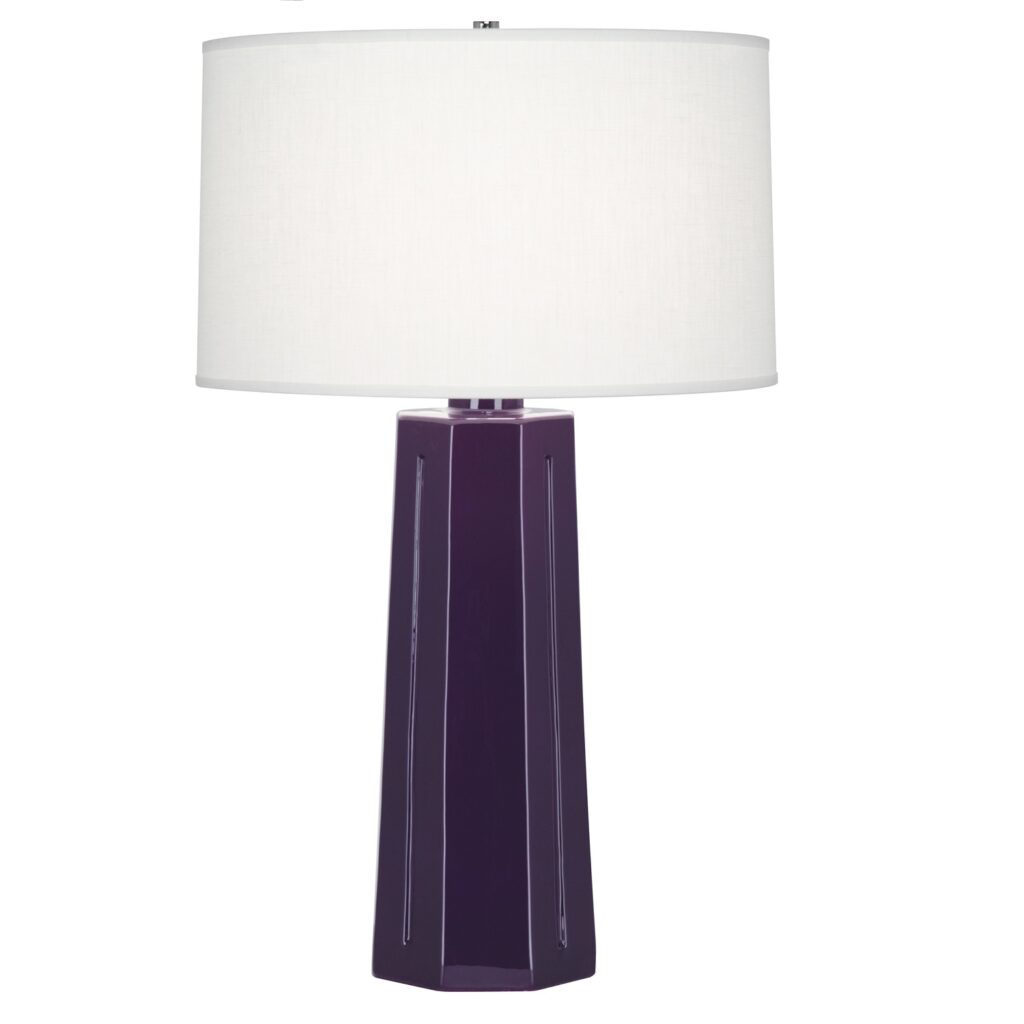 The Mason Table Lamp features an oyster linen shade and a amethyst glazed ceramic base. This piece has a gently tapered geometric design that is thoroughly modern and ideal for adding strong, bold lines to any environment. Mason has a 3-way switch and takes one 150W bulb (max), type A.