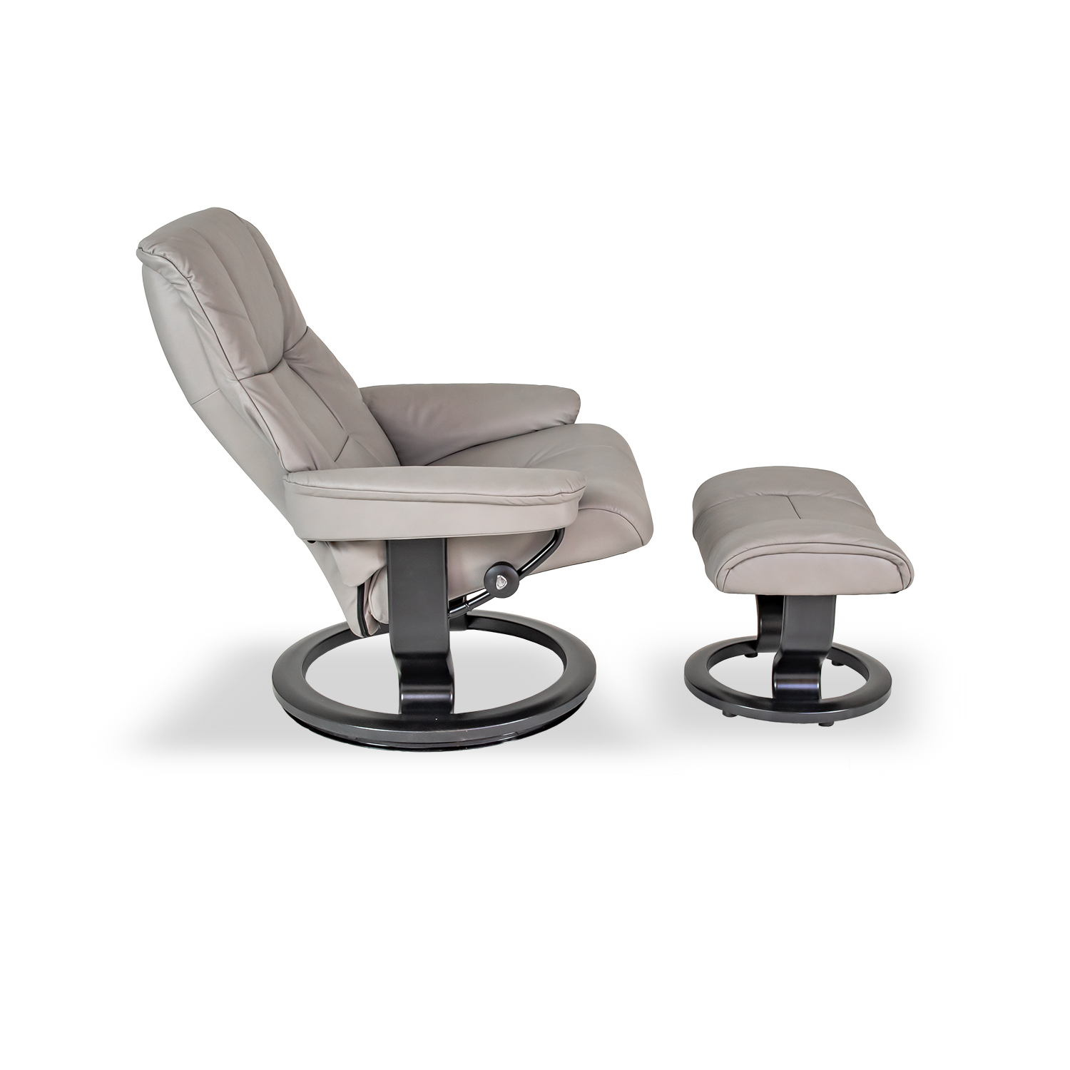 The Mayfair Large Chair and Ottoman, designed by Ekornes of Norway, has a laid-back, elegant design with cutting edge comfort technology. Available with a classic black base and silver grey Paloma leather, this piece has an amply padded back and seat cushions with a lightly tufted stitching pattern that creates a tailored feel and quilted look. The Mayfair chair is equipped with Plus™ and Glide systems, which allow the chair to provide continuous support for the head and lower back, while also adjusting the reclining angle based on shifts of the body. Mayfair will bring timeless style and classic Stressless® comfort to your home.