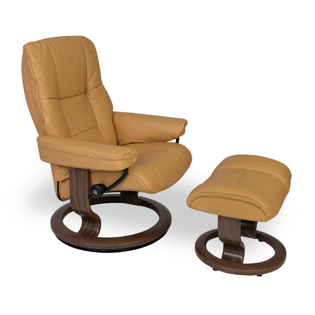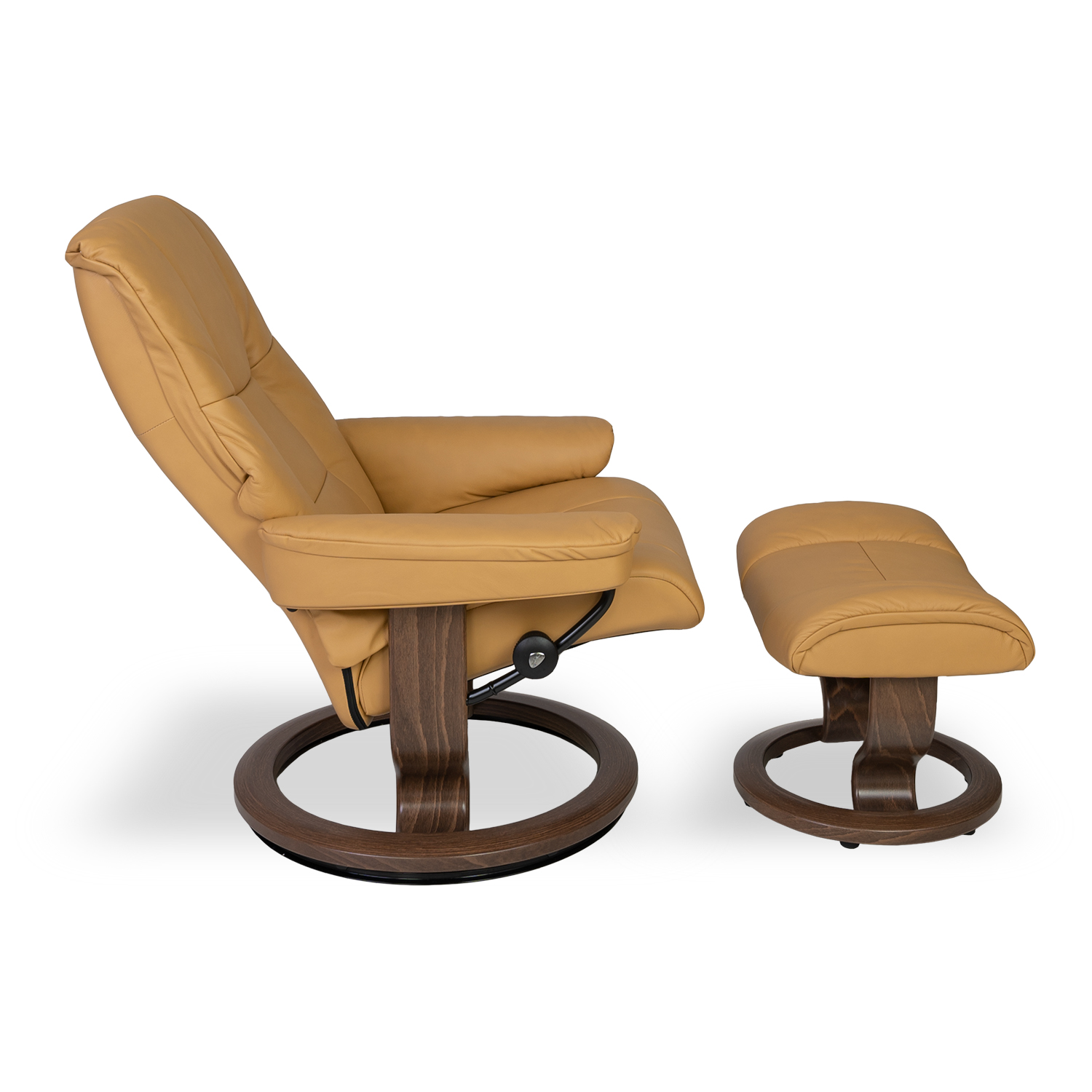The Mayfair Large Chair and Ottoman, designed by Ekornes of Norway, has a laid-back, elegant design with cutting edge comfort technology. Available with a classic walnut base and honey Paloma leather, Mayfair has an amply padded back and seat cushions with a lightly tufted stitching pattern that creates a tailored feel and quilted look. The Mayfair chair is equipped with Plus™ and Glide systems, which allow the chair to provide continuous support for the head and lower back, while also adjusting the reclining angle based on shifts of the body. Mayfair will bring timeless style and classic Stressless® comfort to your home.