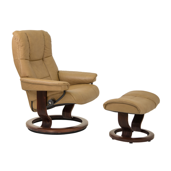 The Mayfair Medium Chair and Ottoman, designed by Ekornes of Norway, has a laid-back, elegant design with cutting edge comfort technology. Available with a classic brown base and taupe Paloma leather, this piece has an amply padded back and seat cushions with a lightly tufted stitching pattern that creates a tailored feel and quilted look. The Mayfair chair is equipped with Plus™ and Glide systems, which allow the chair to provide continuous support for the head and lower back, while also adjusting the reclining angle based on shifts of the body. Mayfair will bring timeless style and classic Stressless® comfort to your home.
