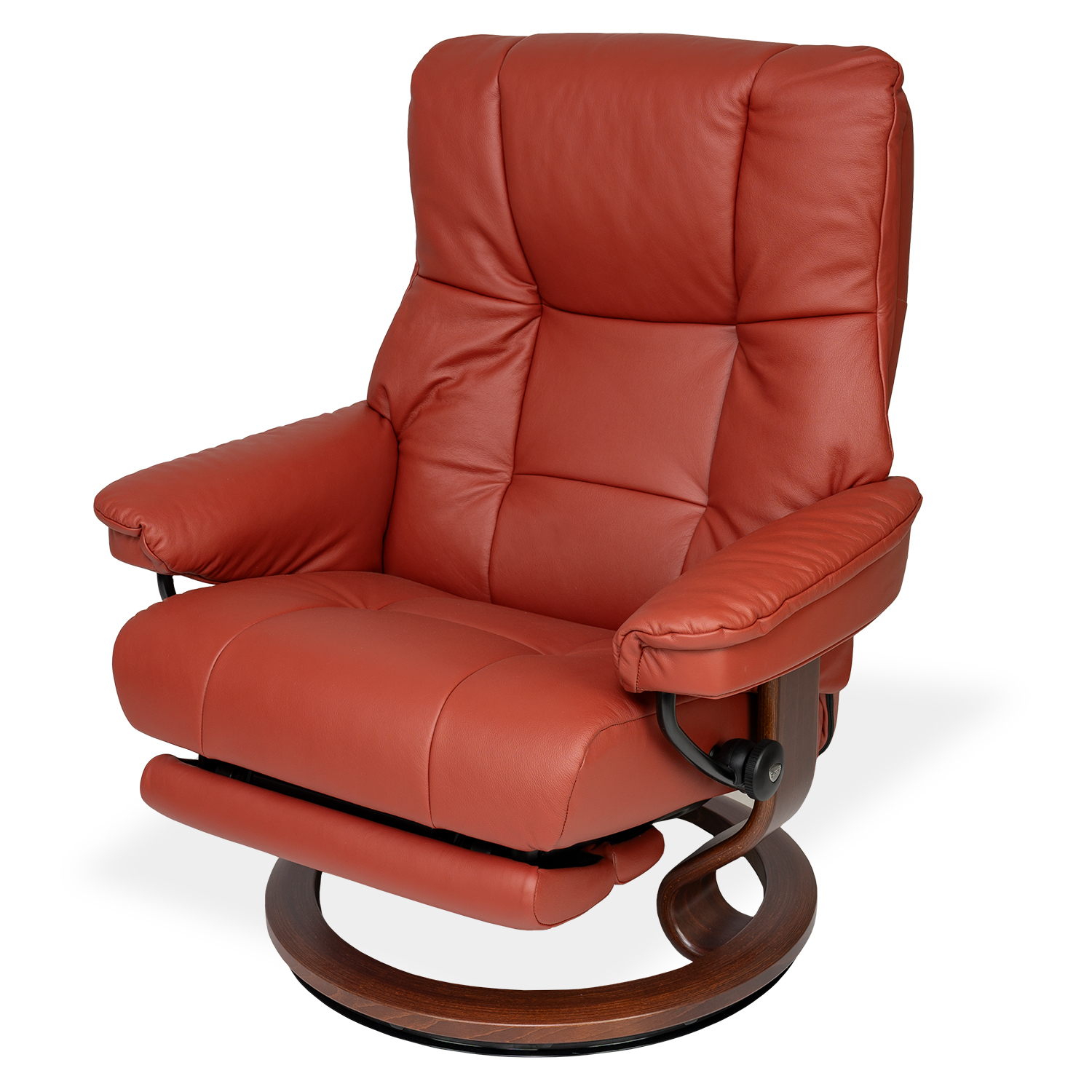 The Mayfair Medium Power Chair, designed by Stressless® of Norway, has a laid-back, elegant design with cutting-edge comfort features and power motion technology. Available with a Classic Power brown base and dark henna Paloma leather, this chair has amply padded back and seat cushions with a lightly tufted stitching pattern that creates a tailored feel and quilted look. Mayfair is equipped with the Plus™ system, which adjusts the headrest to best support your body, as well as power motion buttons that let you recline the footrest and backrest to your preferred position. Mayfair will bring timeless style and classic Stressless® comfort to your home.
