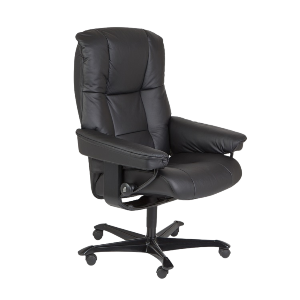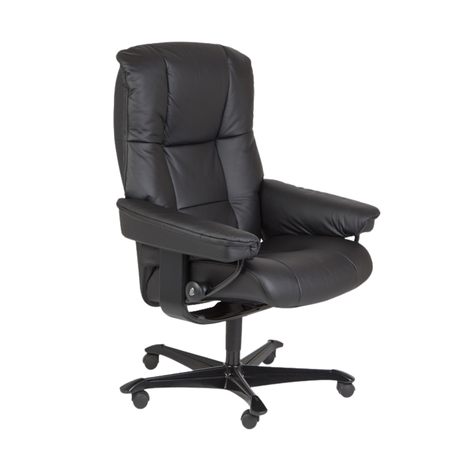 The Mayfair Medium Chair and Ottoman, designed by Ekornes of Norway, has a laid-back, elegant design with cutting edge comfort technology. Available with a classic black base and black Paloma leather, this piece has an amply padded back and seat cushions with a lightly tufted stitching pattern that creates a tailored feel and quilted look. The Mayfair chair is equipped with Plus™ and Glide systems, which allow the chair to provide continuous support for the head and lower back, while also adjusting the reclining angle based on shifts of the body. Mayfair will bring timeless style and classic Stressless® comfort to your home.