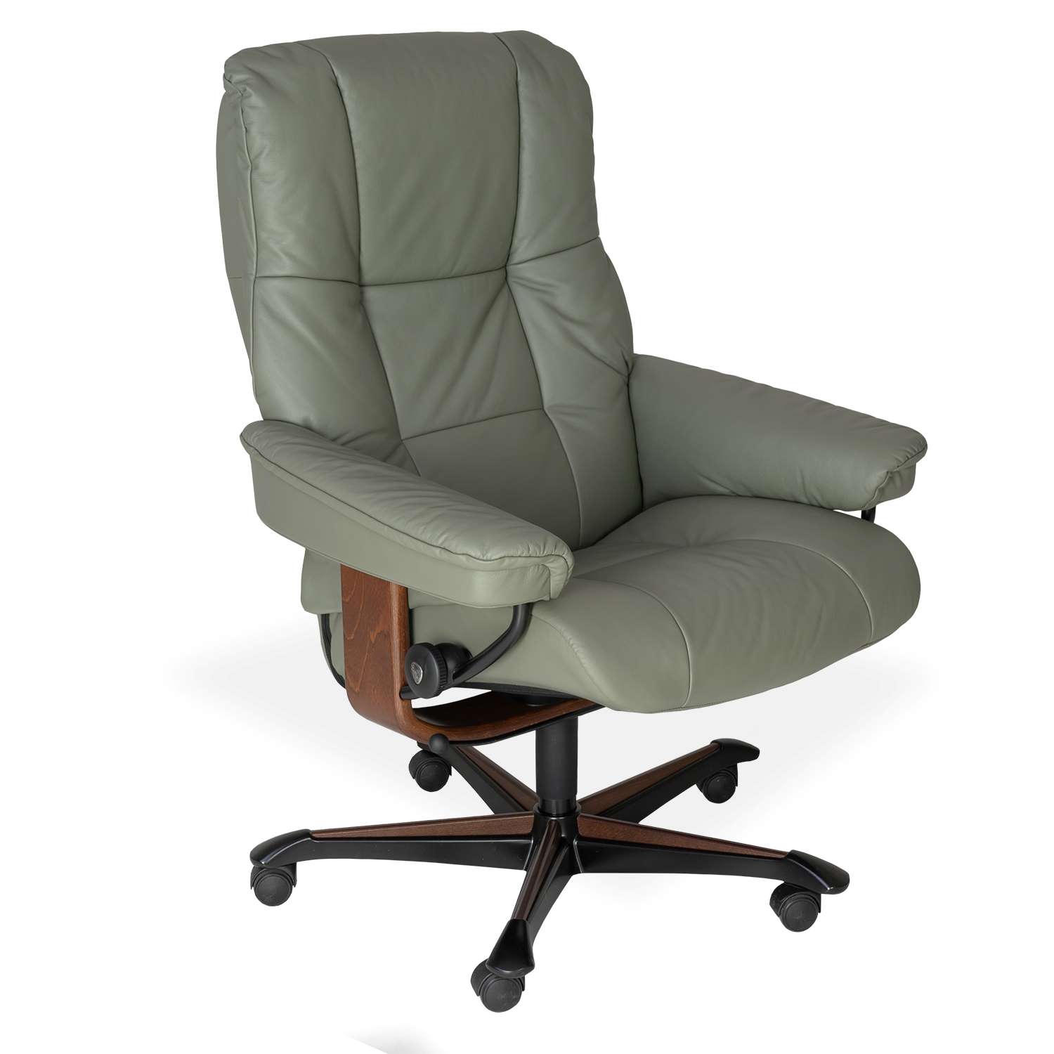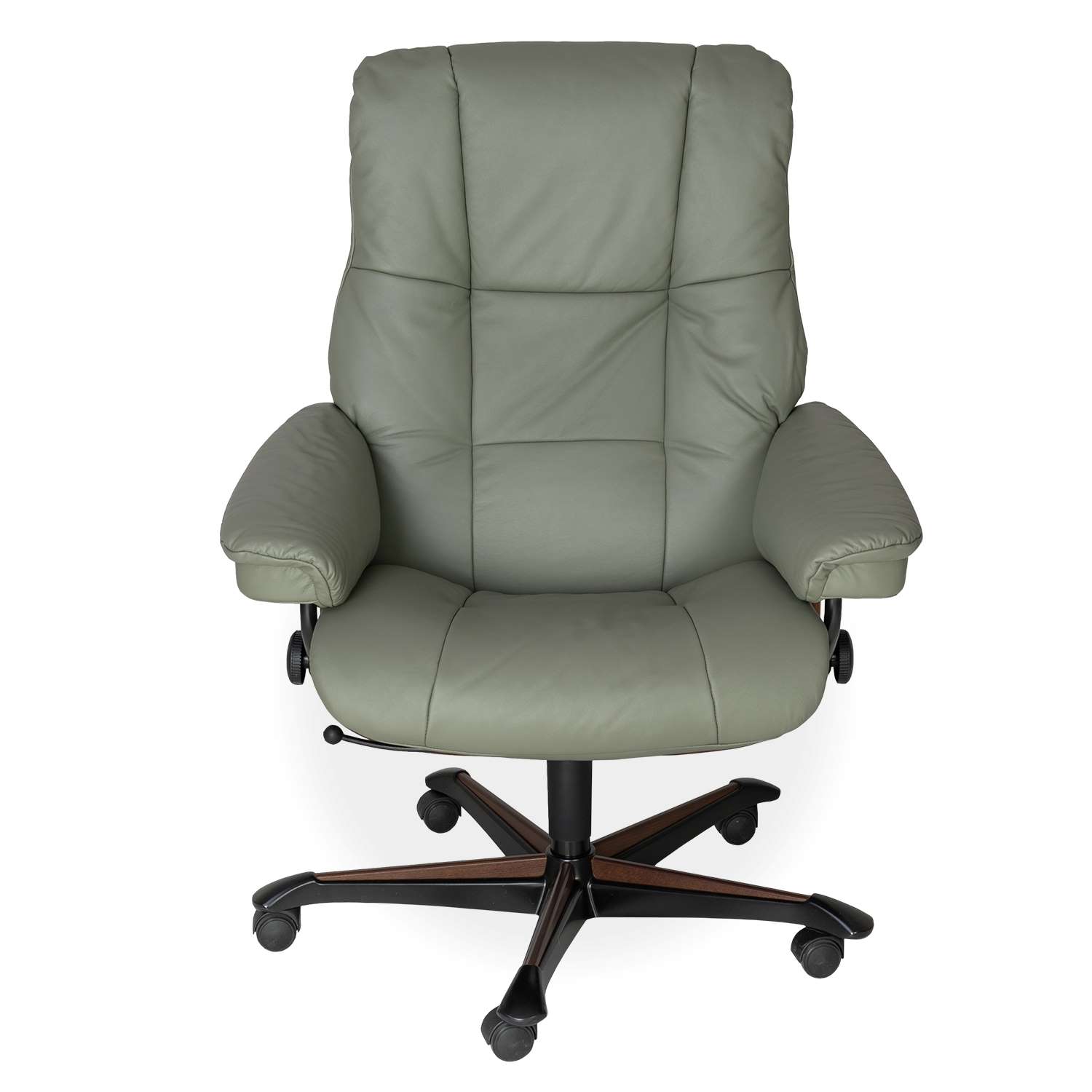 The Mayfair Office Chair by Stressless® has a laid-back, elegant design with classic Stressless® comfort technology. Mayfair is equipped with Plus™ and Glide systems, which allow the chair to provide continuous support for the head and lower back, while also adjusting the reclining angle based on shifts of the body. Amply padded back and seat cushions, and a lightly tufted stitching pattern create a tailored feel and quilted look. A lever located under the seat allows you to adjust the seat height, and the wheeled base makes it easy to maneuver around any space.