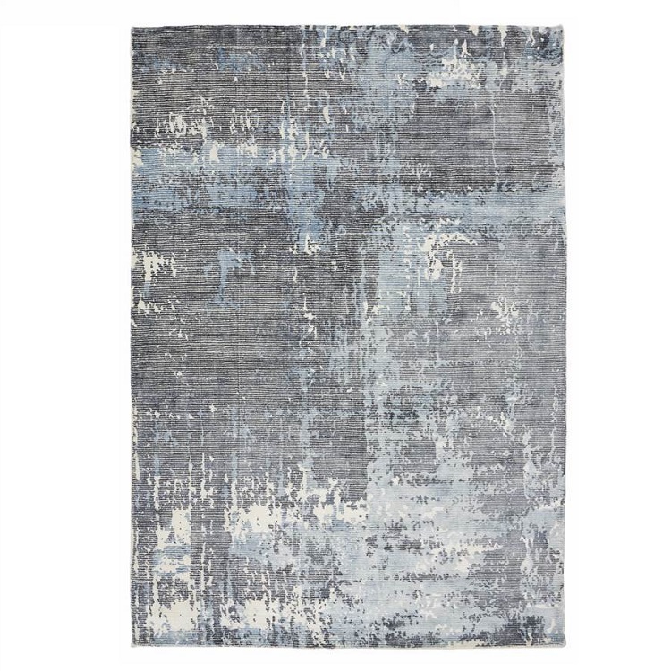 [0] => The Fuller rug, designed in Denmark and loom-knotted from viscose and wool, weaves together subtle tones of dusty blue and grey to form a beautiful "ocean" shade.