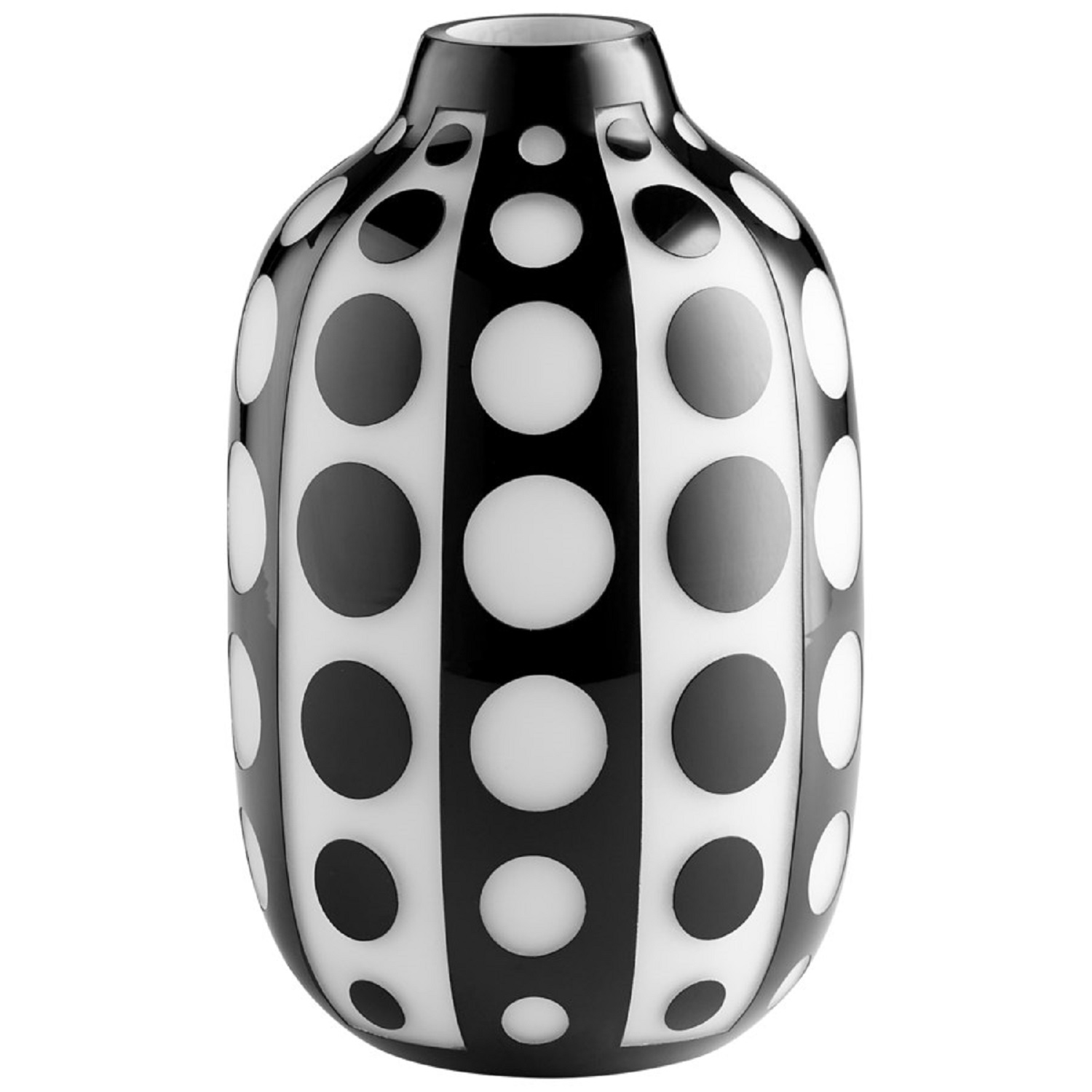The Medium Petroglyph Vase is the perfect minimalist accent to any design environment, with a white glass base intricately detailed with black polka dots, lines, and accents. The circular design of this piece complements its rounded exterior, and the flat base ensures its sturdiness. Display it as an art piece or drop your favorite flowers in.
