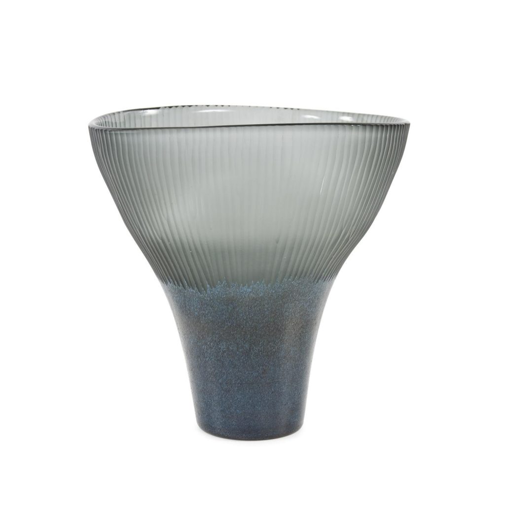 The Melilla Large Vase draws inspiration from the natural beauty of the Mediterranean, particularly the deep turquoise waters. Its rounded, opaque base features a textured finish that tapers into an oval flared top with deep cut, frosted grooves. Beautifully balanced and finished by hand, this vase is both a functional vessel and a striking decorative accent.