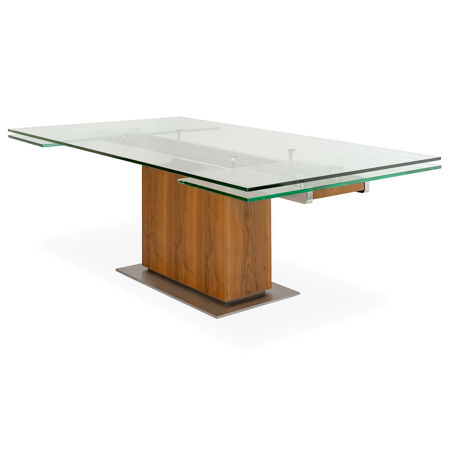 The Mercury dining table is a striking glass top table that features a rich walnut base with a polished stainless steel frame. Mercury has a bold, linear design and is highly functional, with two slide out extensions that extend the tabletop from 75'' - 106.5''