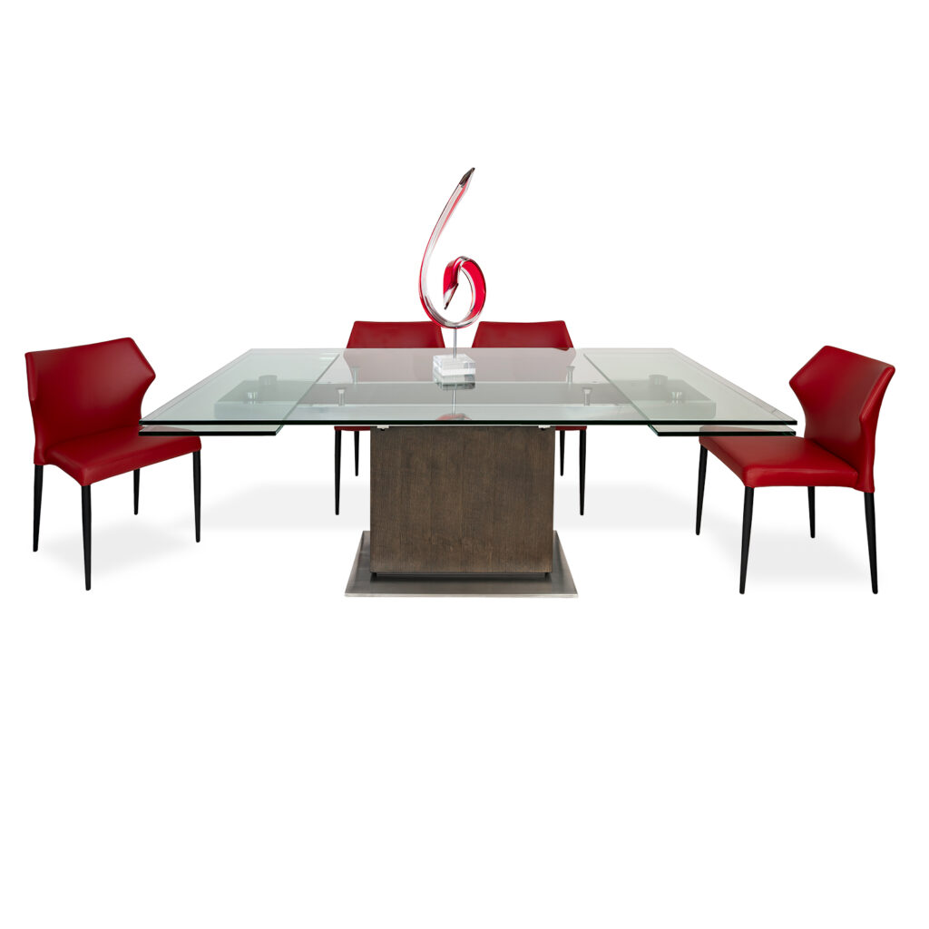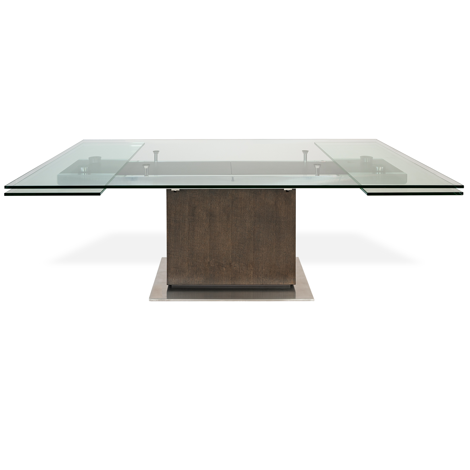 The Mercury Rectangular Table is a striking glass-top table that features a smoked oak base with a mirror-polished stainless steel support bar under the tabletop. The intersection of bold, linear design and high functionality, Mercury has two slide-out extensions that nestle under the top and extend smoothly outward to accommodate large gatherings.