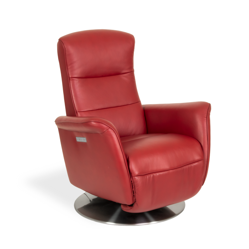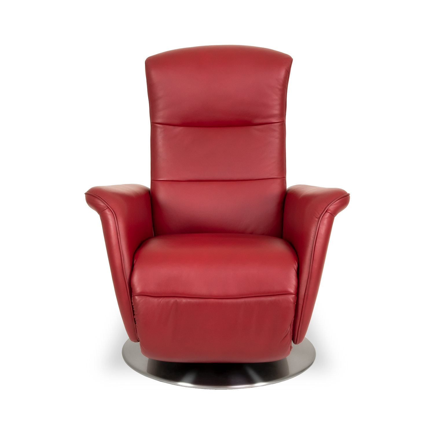 The Mike Large Motion Recliner by Stressless®, available with Paloma cherry leather upholstery and a brushed steel moon base, is the world's only high leg, bottom free, pedestal-mounted glider relaxer. With an integrated patented Plus™ system that adjusts your lumbar and neck support simultaneously, and a soothing rocking motion when seated, this recliner is innovative and designed to maximize your comfort. The tri-fold footrest imbues Mike with a light, clean look without the necessity of an ottoman, as well as gives it a larger range of motion. At the touch of a button, recline to the perfect lounging position for enjoying a book or a show. Fine-tune your comfort by adjusting the position of your legs, lumbar, back and head.